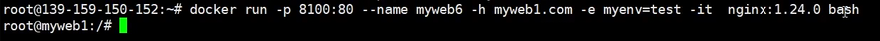 docker run -p 8090:80 --name myweb5 -h myweb1.com -e myenv=test -it nginx:1.23.3 bash