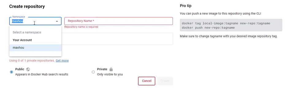 首先需要在 Docker Hub 官网注册账号。登录后,在 Dashboard 页面选择创建新仓库(Repository)。