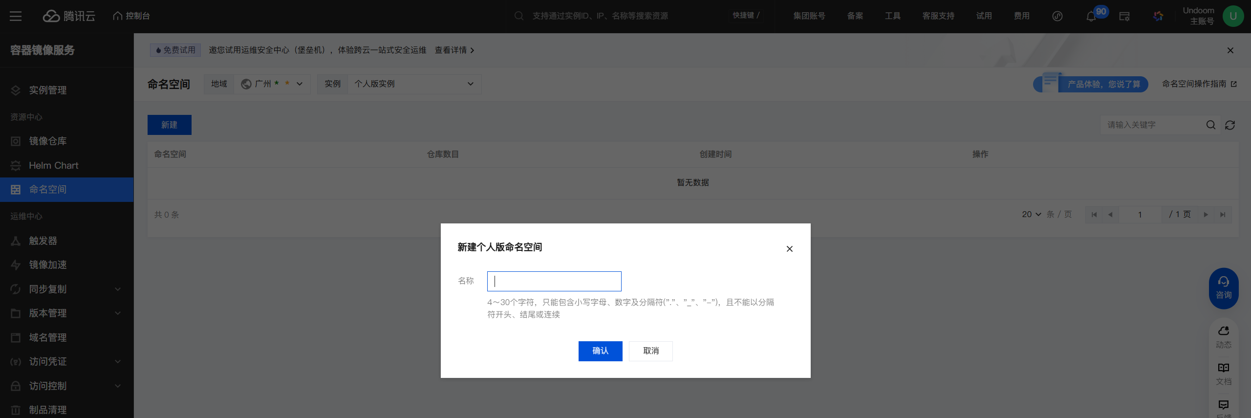 在"镜像仓库"管理页,首次使用需初始化访问凭证(设置独立的 Registry 登录密码)。随后,创建一个"命名空间"(Namespace)。命名空间用于隔离不同项目或团队的资源。