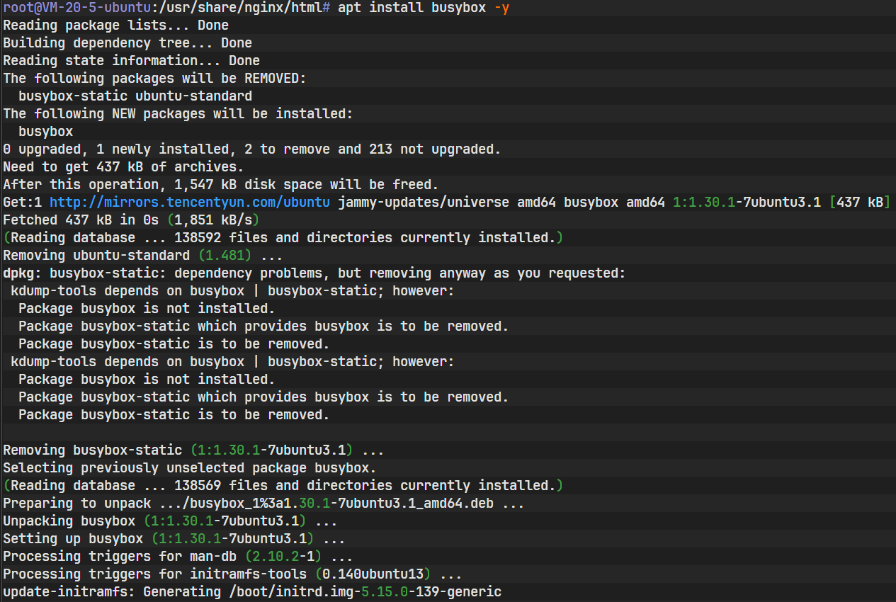 上图展示了 apt 包管理器自动下载并解压配置 busybox 的过程。