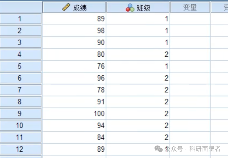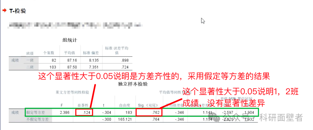从组统计 中可以看到一班和二班的统计个案数、平均成绩、标准偏差等。从独立样本检验 中看到有有假定等方差和不假定等方差两行。我们首先看方差齐性检验的显著性,发现是大于0.05的,说明是保留假设检验,因此看假定等方差 这行统计结果。平均值等同性t检验中t的值是-0.304,自由度是183,显著性值是0.762大于0.05,说明一班和二班的成绩不存在显著差异,两位老师的教学水平差不多。