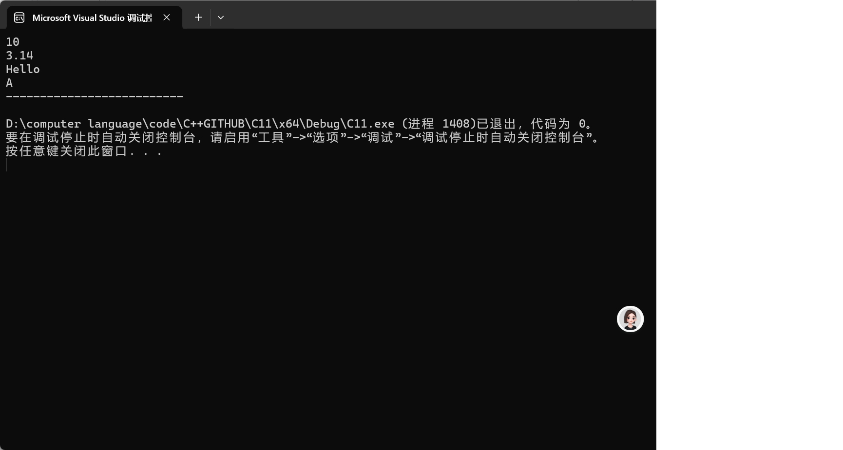 print(10, 3.14, "Hello", 'A')调用print<int, double, const char*, char>(10, 3.14, "Hello", 'A')。- 打印