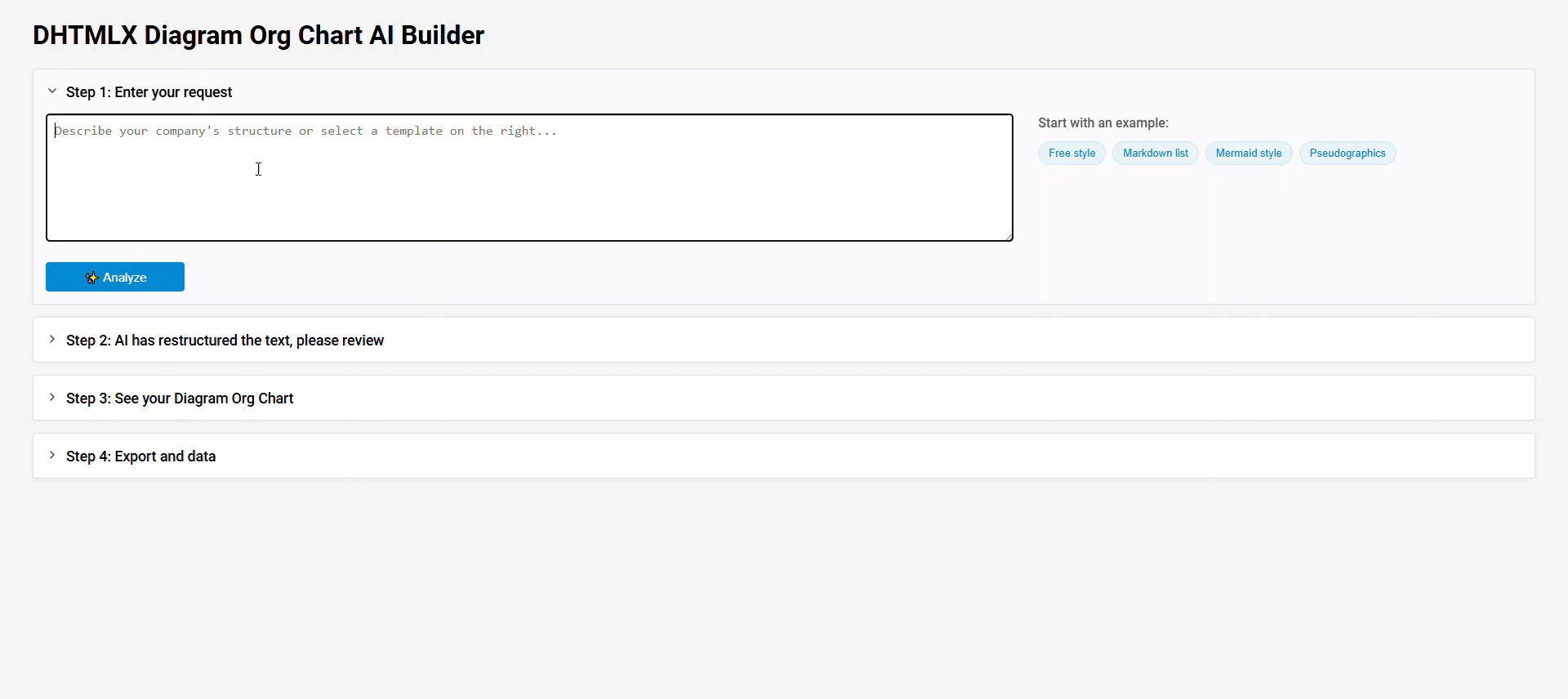 该 Demo 展示了**DHTMLX Diagram**的组织结构图(Org Chart)如何借助 AI 实现复杂结构自动化生成。