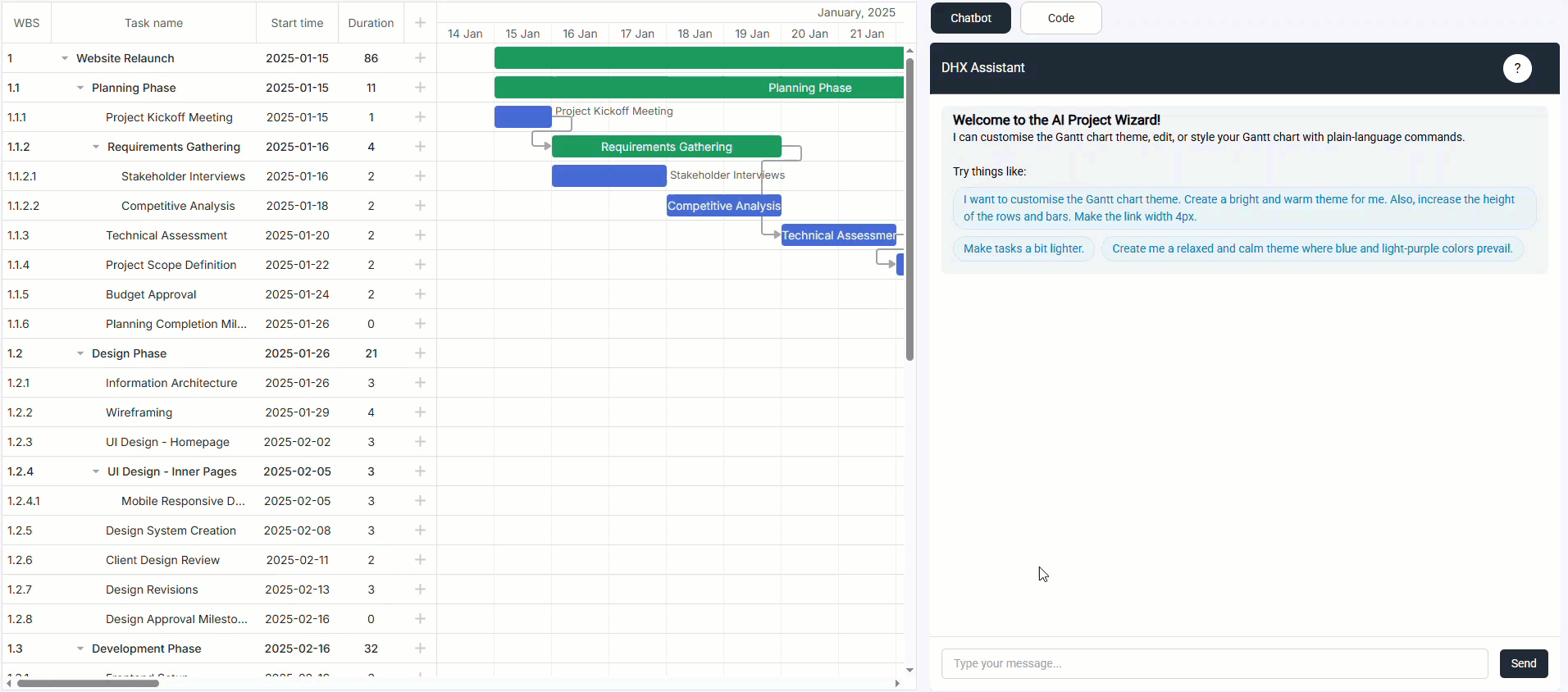 DHTMLX近日推出了 3 个全新 Demo,展示了 AI 如何显著提升 Gantt 甘特图 与 **Diagram 组织结构图**的使用体验。通过简单的自然语言指令,用户即可自动生成项目结构、创建甘特图主题、构建复杂组织结构图。