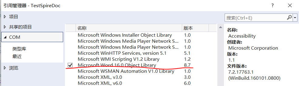 VS2022中通过添加Com引用添加Microsoft Word Object Library组件。