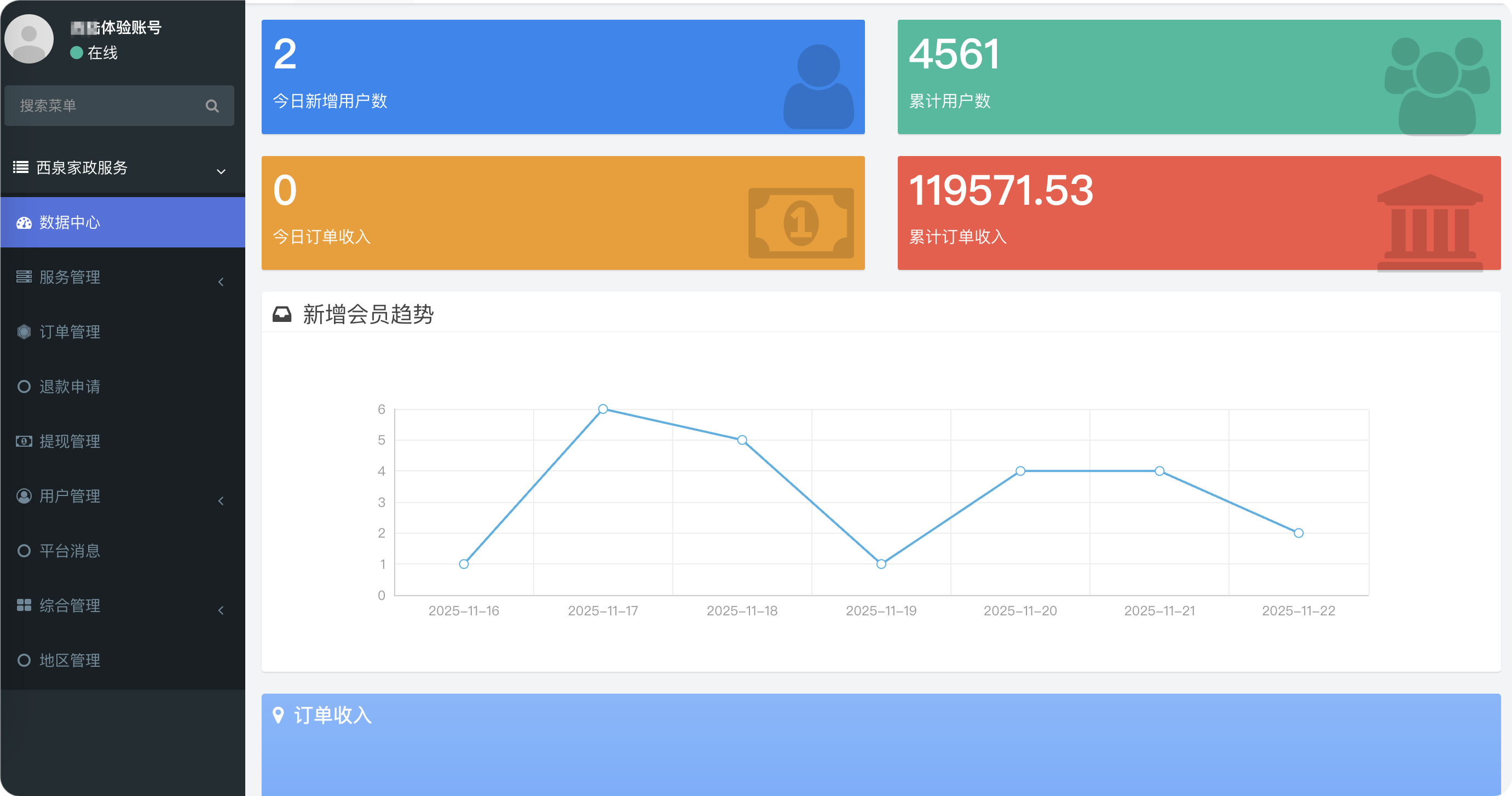 数据驾驶舱,一览无余 :后台首页直观展示今日新增用户、今日订单收入、累计用户数、累计订单收入等核心数据,并通过折线图清晰呈现新增会员趋势与订单收入变化,助力运营决策。