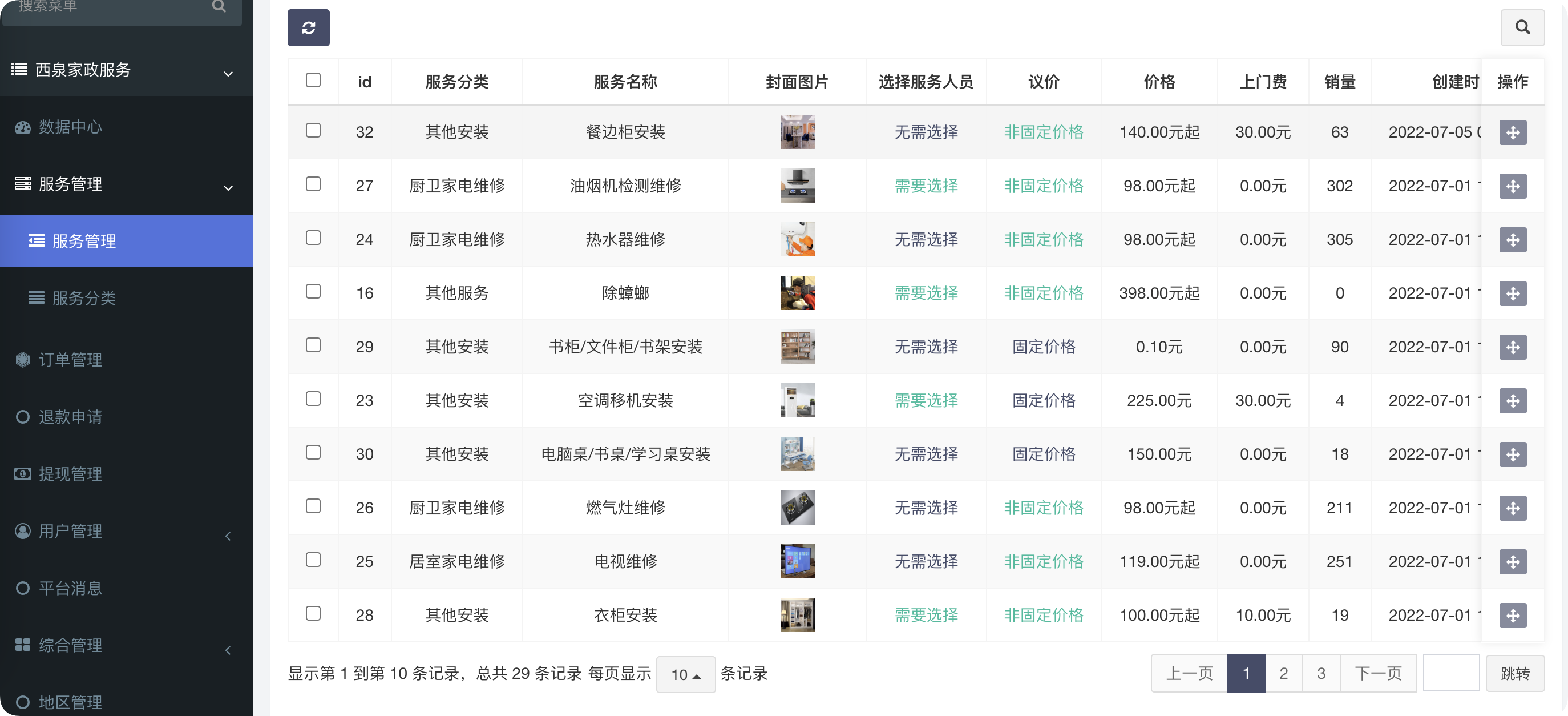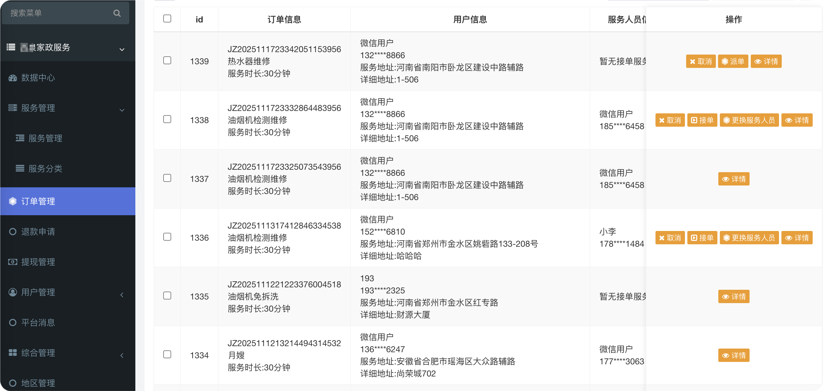 精细化服务与订单管理:运营者可对平台上所有服务项目进行分类、上架/下架、首页推荐权重设置等管理。同时,所有订单详情,包括服务内容、用户信息、分配的服务人员均一目了然,支持进行全局调度与监控。