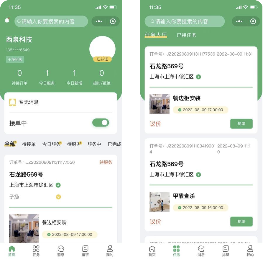 任务大厅,自主抢单:服务者可以进入"任务大厅",查看附近所有的待接订单,根据自己的专业技能和排班情况自主"抢单",工作安排更灵活。