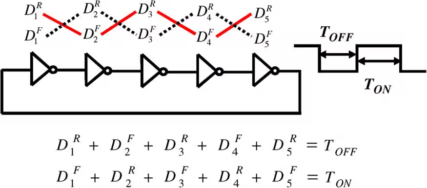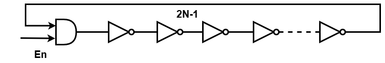 - 由于反相器的数量是奇数,信号每环绕一圈,其逻辑电平都会发生一次翻转(例如,从高变低)。