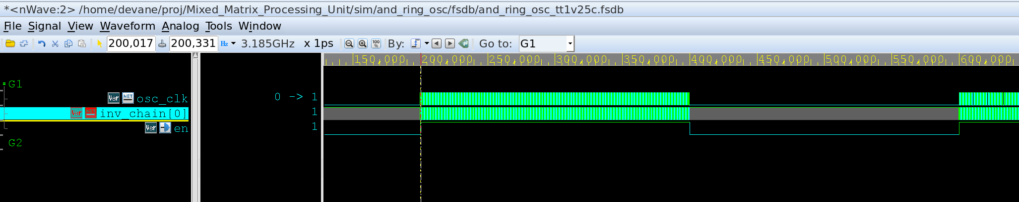项目采用28nm工艺库,完成了DC综合后仿/post,完成上述ring_osc设计,TT1V25C条件下的osc波形如下,可以看到在该条件下,ring_osc的频率为3.185Ghz。