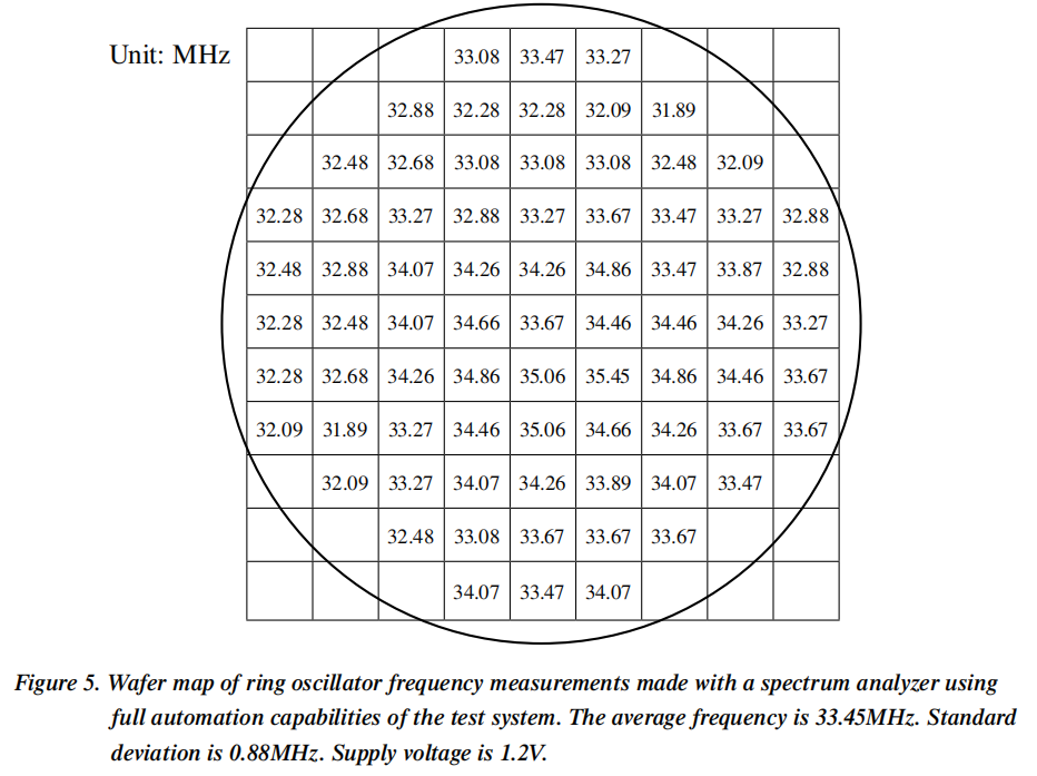 图3显示了跨越整个300mm晶圆的环形振荡器频率测量的晶圆图。整个晶圆的平均振荡频率为33.45MHz,标准偏差为0.88MHz。结果表明了生产晶圆的均匀性。
