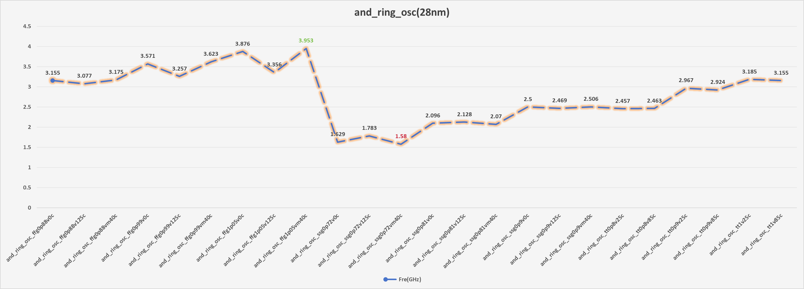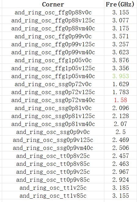 - 其中,ffg1p05vm40c 条件下频率最高,为3.953Ghz,ssg0p72vm40c条件下频率最低,为1.58Ghz。