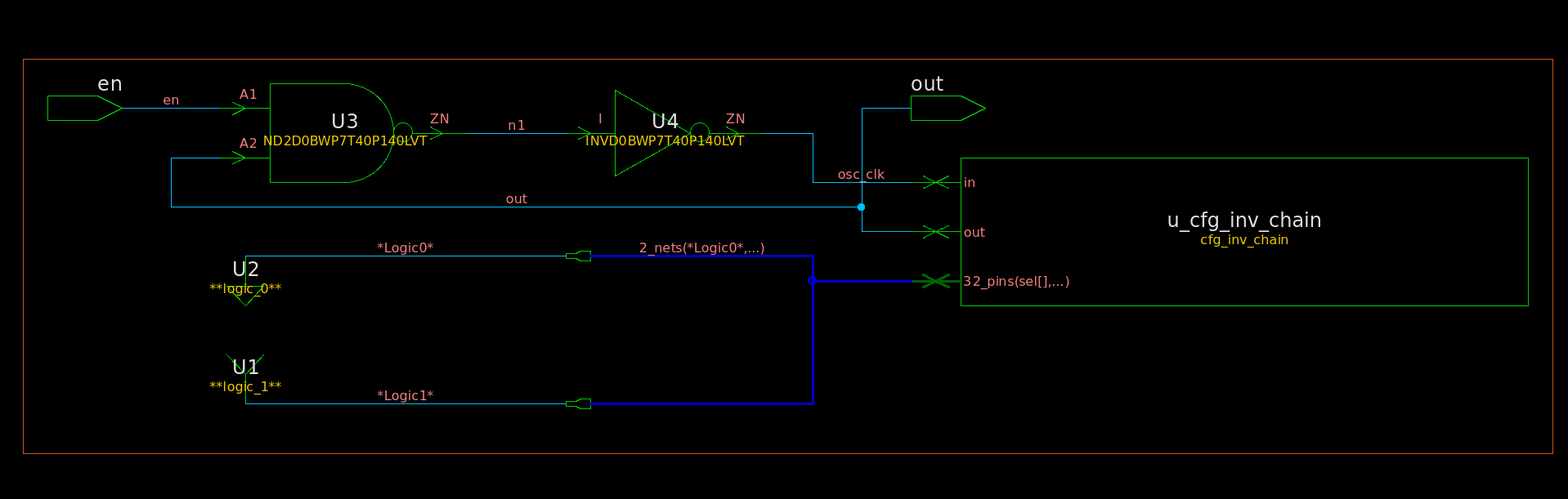 项目设计的ring_osc如下,enable信号和奇数级反相器链的输出经过and门后作为反相器链的输入,通过利用ring_osc在不同corner下的综合的时钟频率,可以在silicon后获取对应的corner,帮助debug。