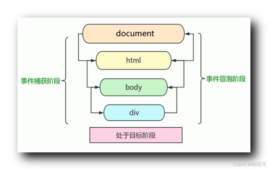 - 传播方向 : 顶层 document 元素 -> html 元素 -> body 元素 -> ... -> 父元素 -> 目标元素的父元素 -> 目标元素 ;