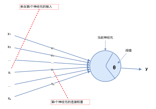 其中 xix_ixi 表示来自第 i 个神经元的输入,wiw_iwi 表示第 i 个神经元的连接权重,θ 表示阈值,f 是激活函数。