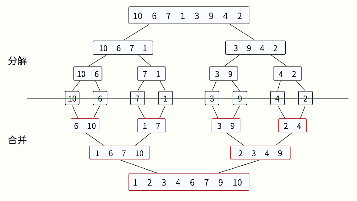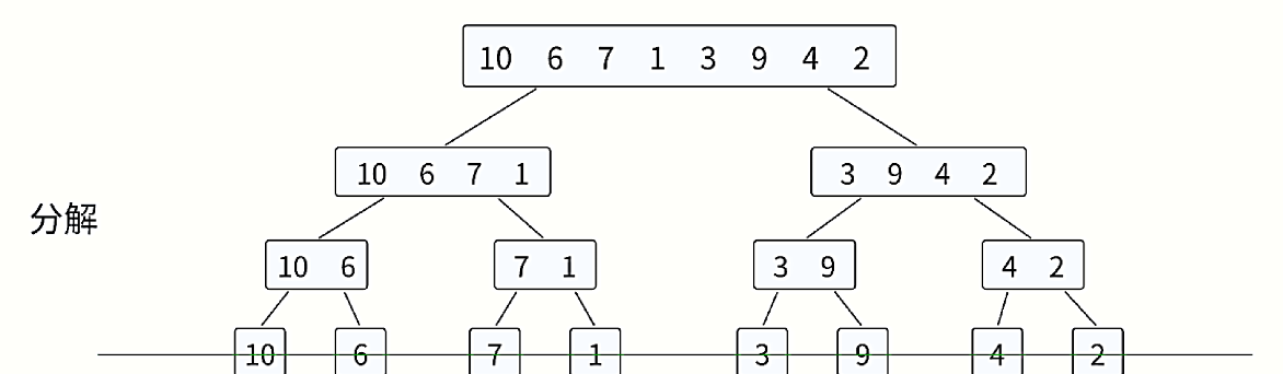 但我们想一下如果按照刚刚的逻辑是不是每次递归都需要先判断当前数组是否已经有序,这样其实会显的麻烦,所以我们考虑直接递归到底,也就是递归到两个部分只有一个数为止,也就如上图所示。