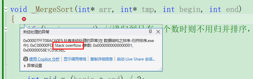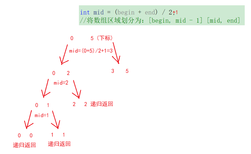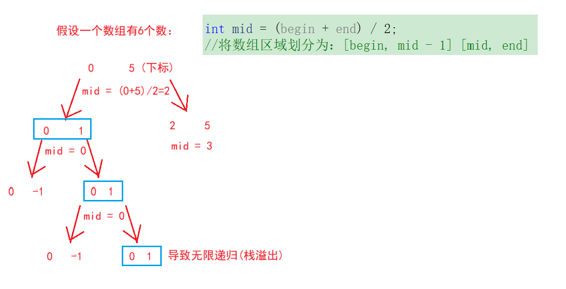 我们会发现栈溢出 问题的出现就是因为中间值下标mid取的有问题 ,我们知道整型的除法是会取整的,所以奇数的取中是会有问题的;而且当递归只剩下两个数 的时候,下标之和 是一定为奇数 的,这样就会导致如图所示**[mid, end]** 这个区间会一直不变 导致无限递归的情况,而递归一次就需要在栈区开辟新的空间,无限的递归就会导致栈溢出的问题。