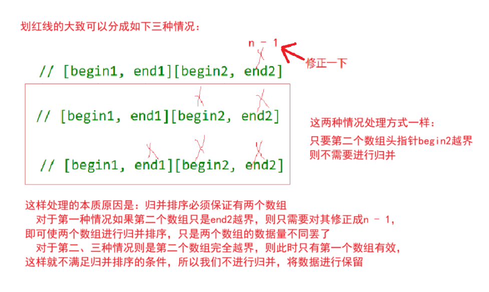 if (end2 >= n) //第二个数组部分越界,则对其尾部进行修正即可