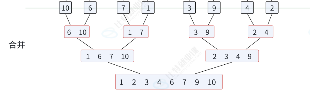 归并排序的整体思路就如上图所示,首先归并排序 其实有点类似我们在C语言学习中遇到的一个问题:两个有序数组合并成一个有序数组 。之所以类似就是因为图中的合并过程就与其如出一辙,所以归并排序是需要借助一个新数组用于存放调整排序后的数据。