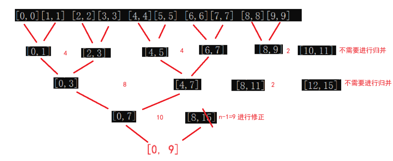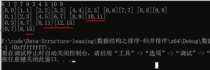 如果假设一个数组有10个数据,此时我们还是按照上面的代码实现的话,我们在每次归并排序前将归并的范围进行打印,就会出现下面的情况: