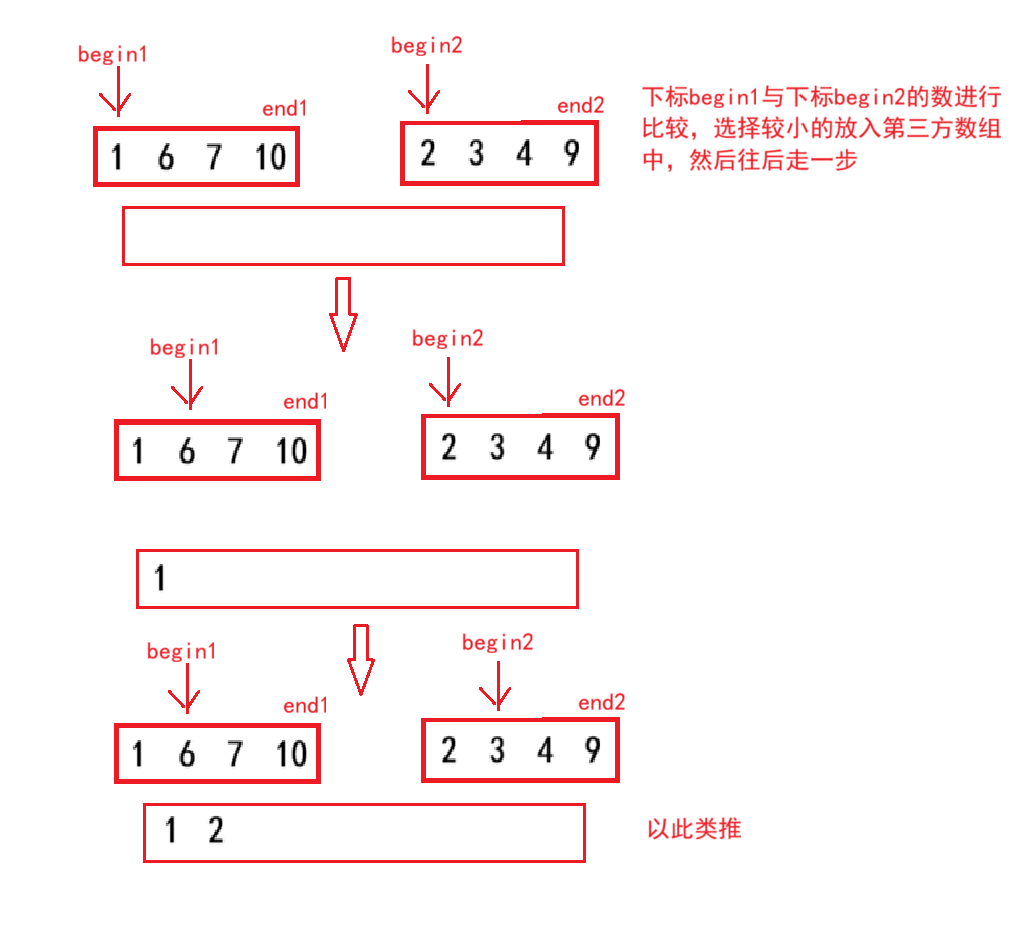 while (begin1 <= end1 && begin2 <= end2) //有一个数组先走完则跳出循环