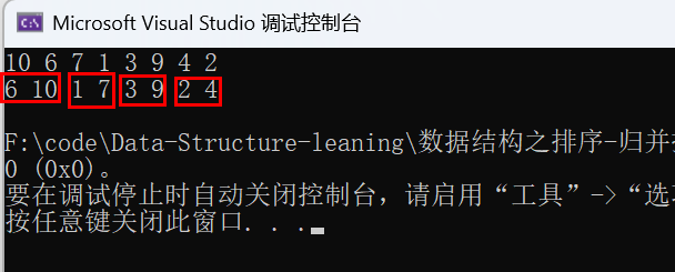 我们通过打印结果发现所写11归并的代码的确没问题,每两个数为一组是各自有序的。那接下来我们就需要对gap进行改变 了,上面我们提到了每完成一层的归并排序下面一层的数组数据个数是上面一层的两倍 ,所以每次完成一层归并排序我们的gap = 2 * gap。