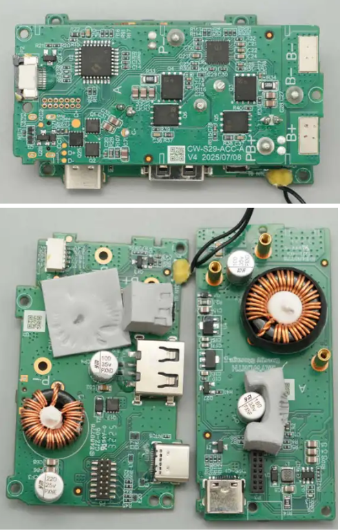 第二层PCB的两面,有一个IP2366电路用于100W输入输出,锂电池保护芯片CM1361,电量计量CW2217