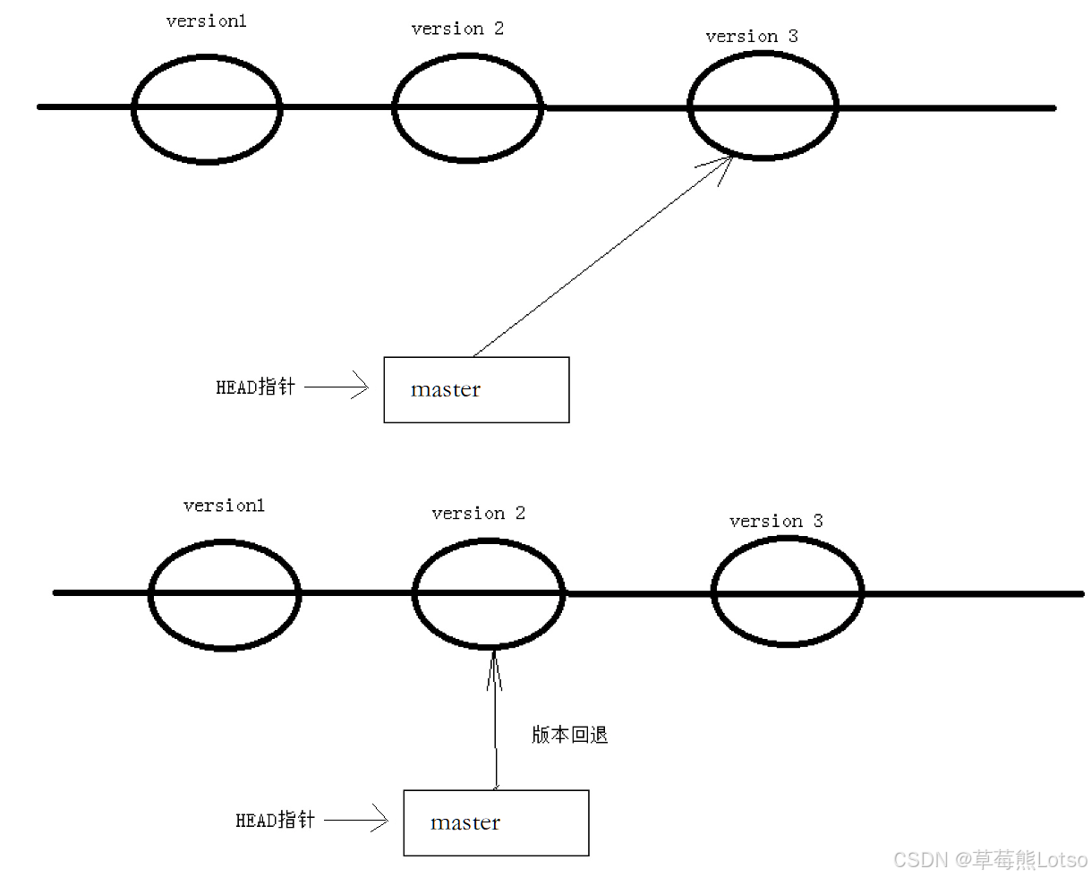 Git 版本的回退速度特别快,因为 Git 在内部有个指向当前分支(此处是master)的HEAD指针,refs/heads/master 文件里保存当前 master 分支的最新的 commit id 。当我们在回退版本的时候。Git 仅仅是给refs/heads/master 中存储一个特定的version ,可以简单理解为如下示意图: