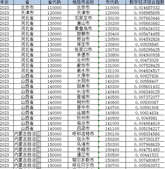 2\]张雪玲,焦月霞.中国数字经济发展指数及其应用初探\[J\].浙江社会科学,2017(04):32-40+157. 字段包括年份 省 省代码 地级市名称 市代码 数字普惠金融指数 互联网相关产出 互联网普及率(%) 移动互联网用户数 互联网相关从业人员数 数字经济综合指数的综合指数。 数据主要来源于《中国城市统计年鉴》及权威机构报告,如北京大学数字金融研究中心编制的数字普惠金融指数。其应用价值体现在三方面:一是为地方政府制定数字经济政策提供量化依据,如优化基础设施或产业布局;二是助力学术研究,如分析数字经济与区域经济、创业活跃度的关联性;三是辅助企业投资决策,通过指数差异识别潜力市场。研究可结合分项指标深入探讨驱动因素,例如数字金融对欠发达地区的拉动效应。