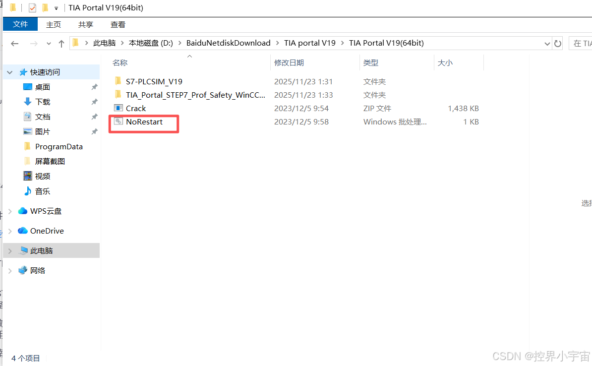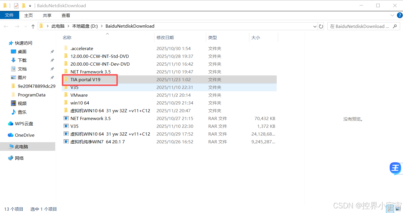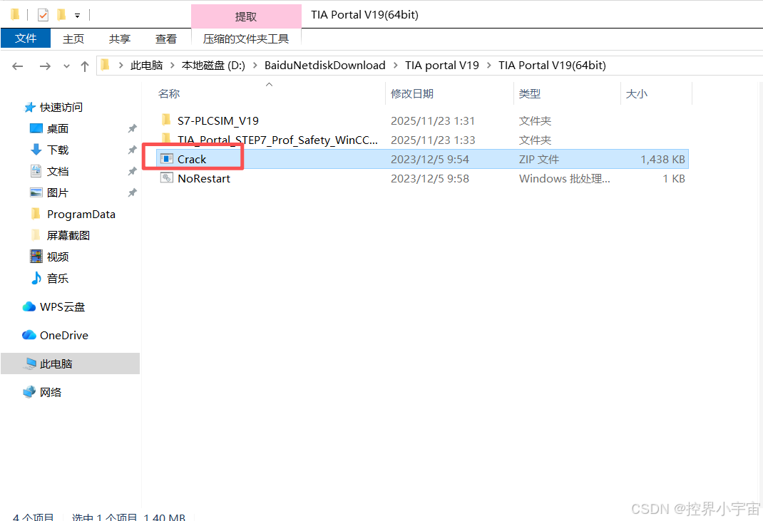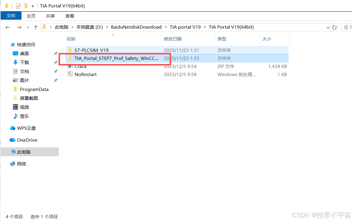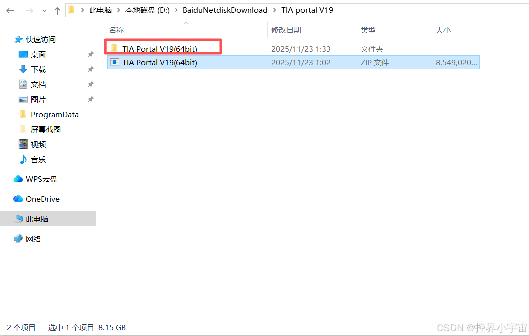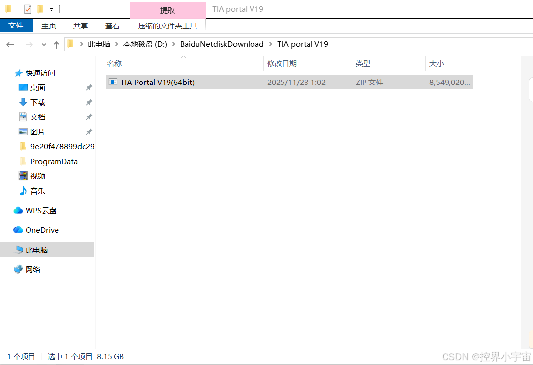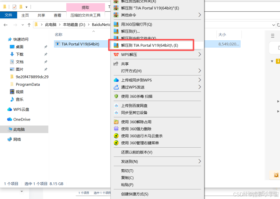 - 右键下载的【TIA portal V19 (64bit)】压缩包→选择「显示更多选项」→「解压到 TIA portal V19 (64bit)」(建议解压到 D 盘,避免 C 盘空间不足);