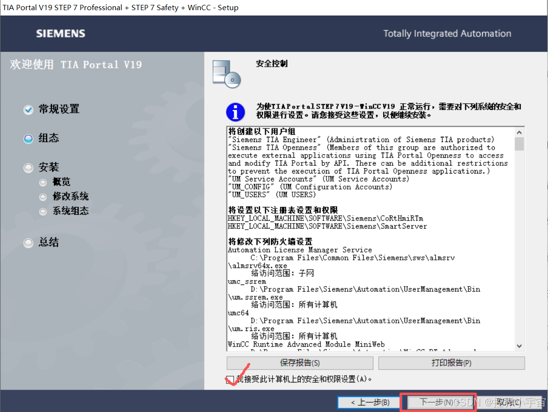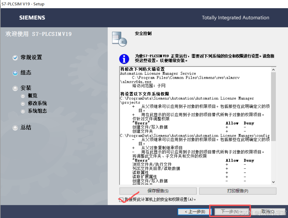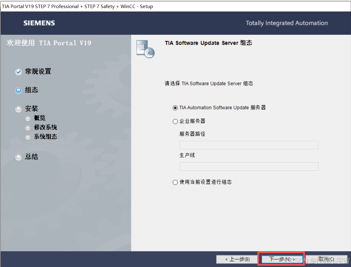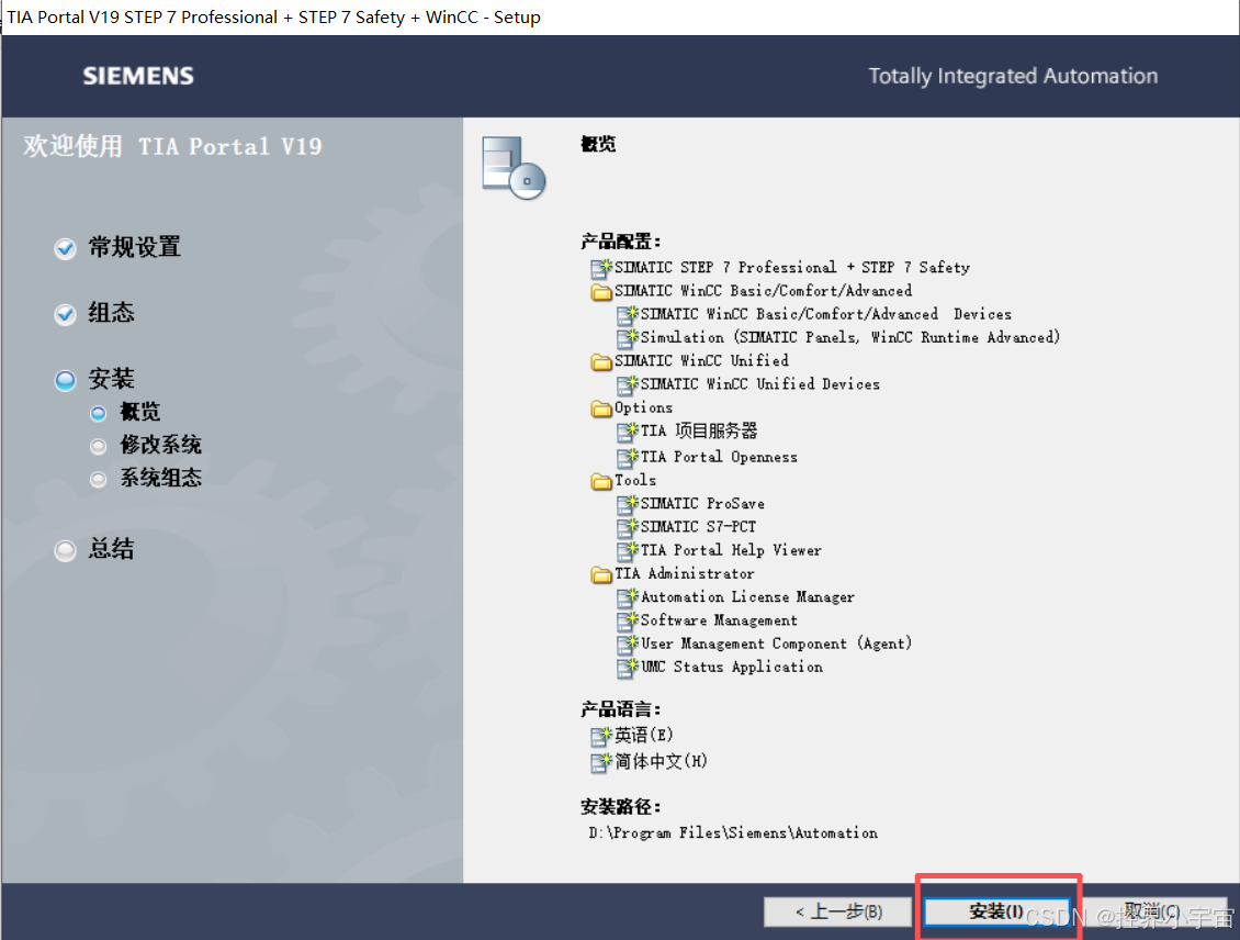 - 修改安装路径:默认 C 盘,可将路径首字符「C」改为「D」(如 D:\Program Files\Siemens\TIA Portal V19),点击「下一步」;
