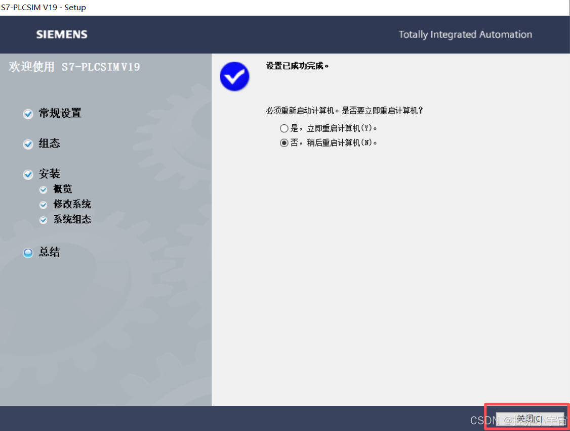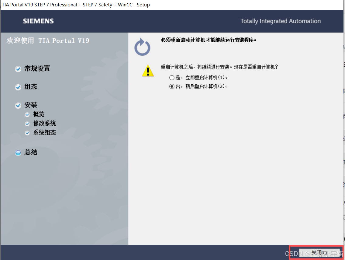 - 弹出重启提示时,选择「否,稍后重启计算机」→点击「关闭」。