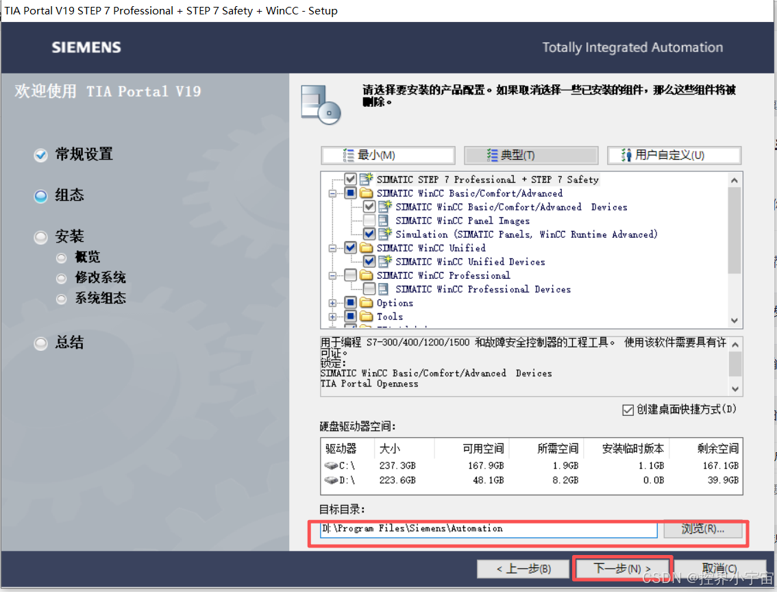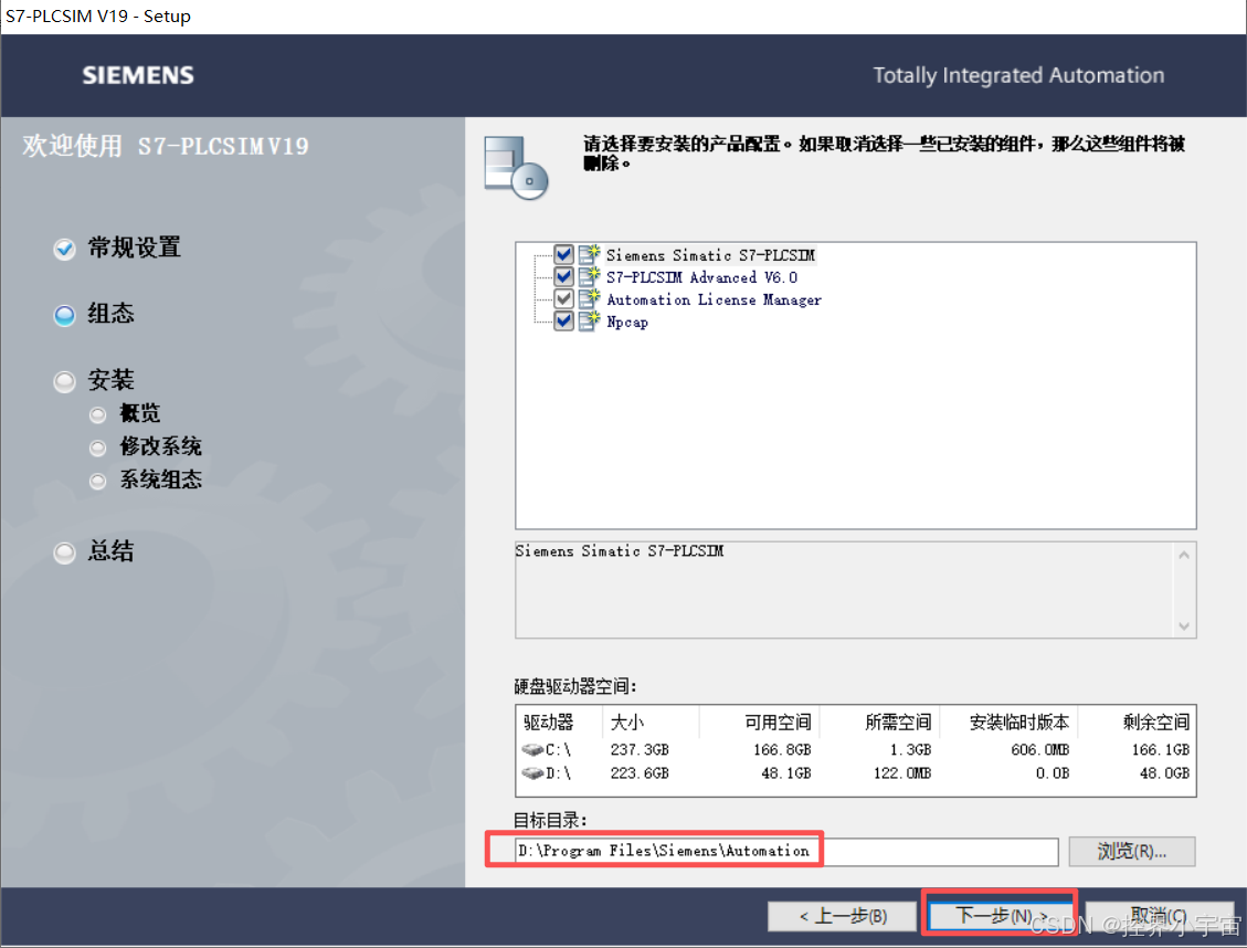- 修改安装路径(建议与 STEP 7 一致,如 D 盘),点击「下一步」;