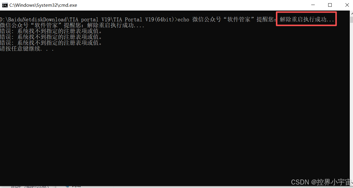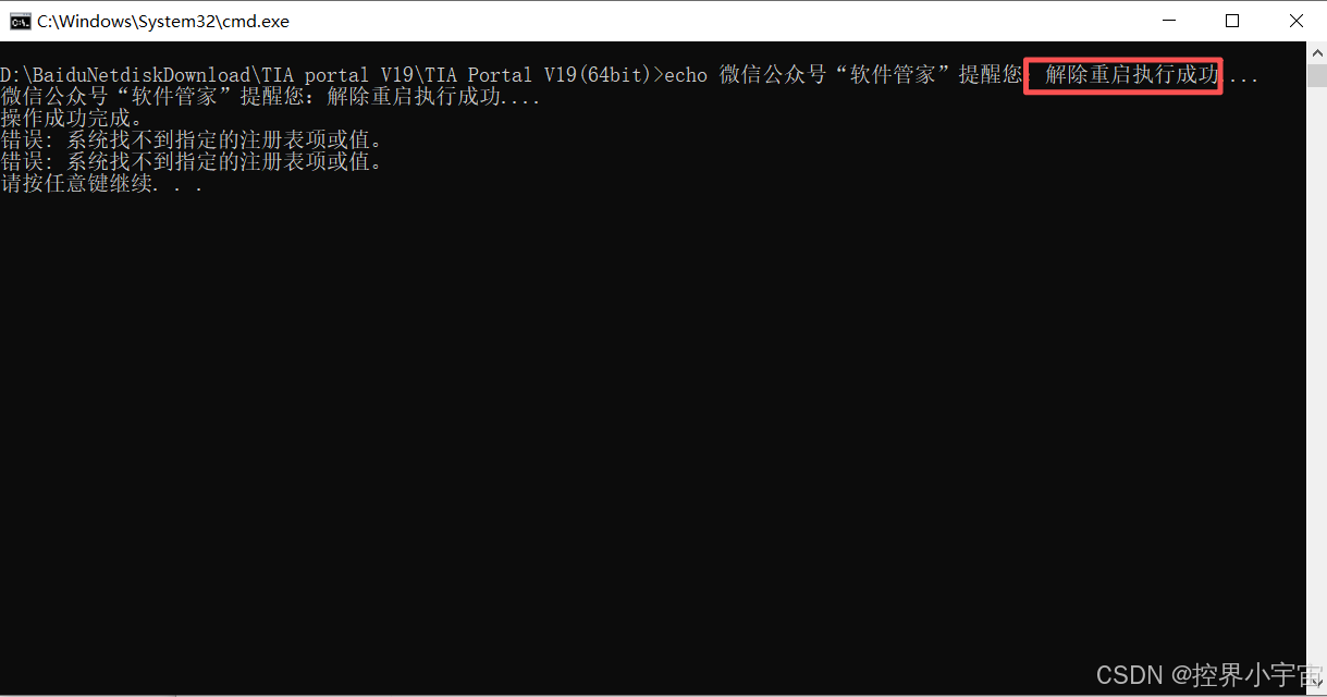 - 弹出 "解除重启执行成功" 提示后,点击右上角「X」退出(此步骤避免安装中强制重启)。