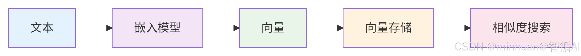 - 向量化:将文本转换为数值向量(嵌入向量)。