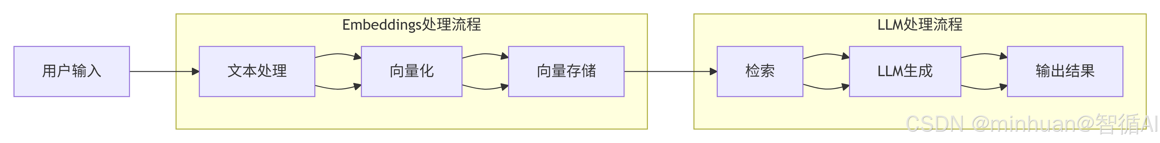 - 流程分为两个主要子流程:Embeddings处理流程(包括文本处理、向量化、向量存储)和LLM处理流程(包括检索、LLM生成、输出结果)。