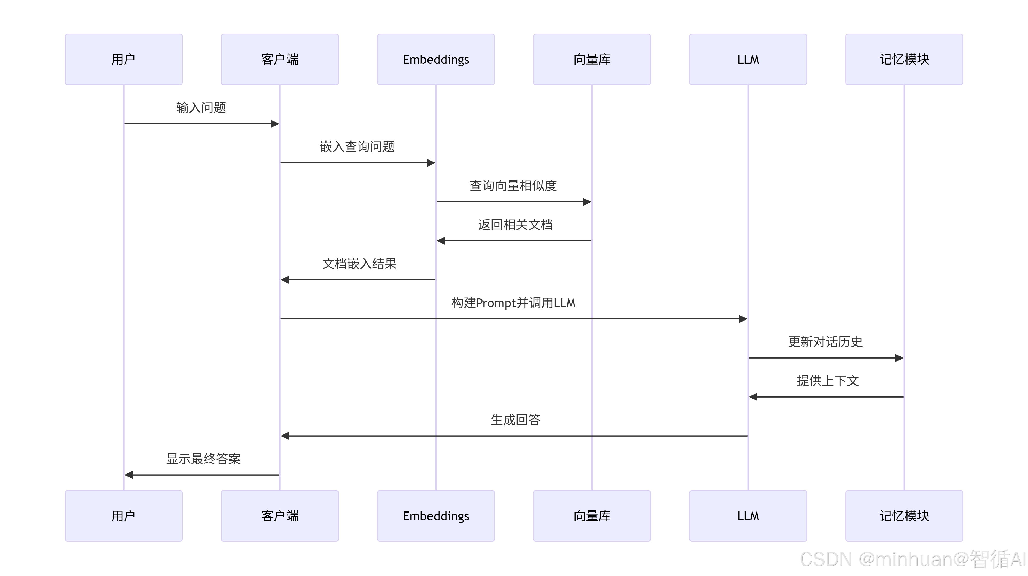 - LLM生成回答:LLM根据Prompt和对话历史生成回答,并返回给客户端。