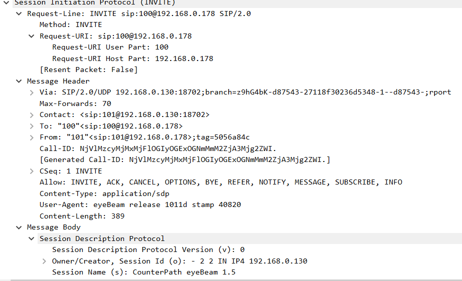 各字段示例如下,INVITE报文的message body是SDP协议。