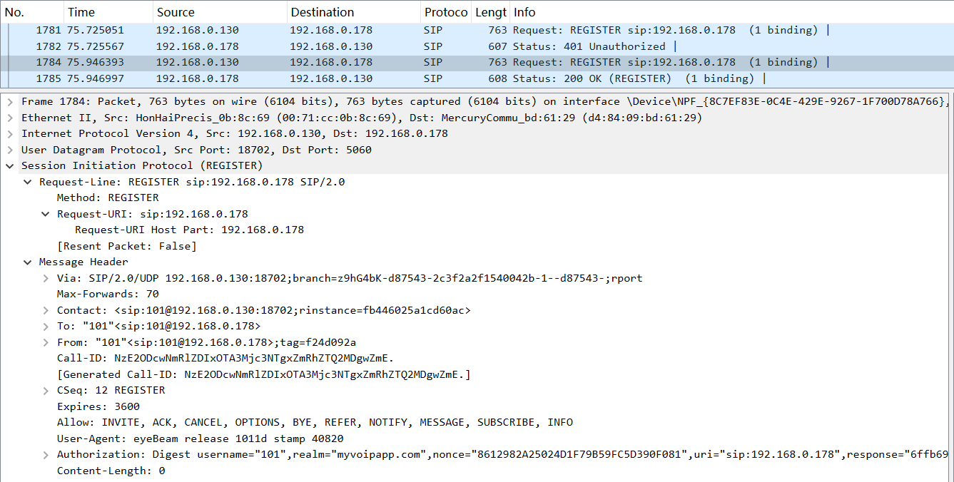 对于无需认证,即不需要密码的注册流程,只需要发送两个报文,register报文后,服务器回复200 ok,表示注册成功。