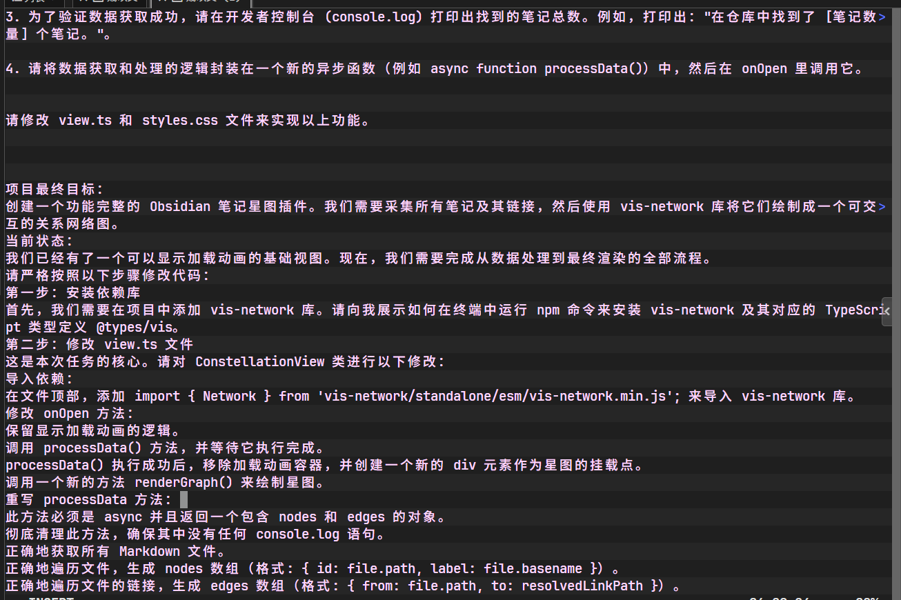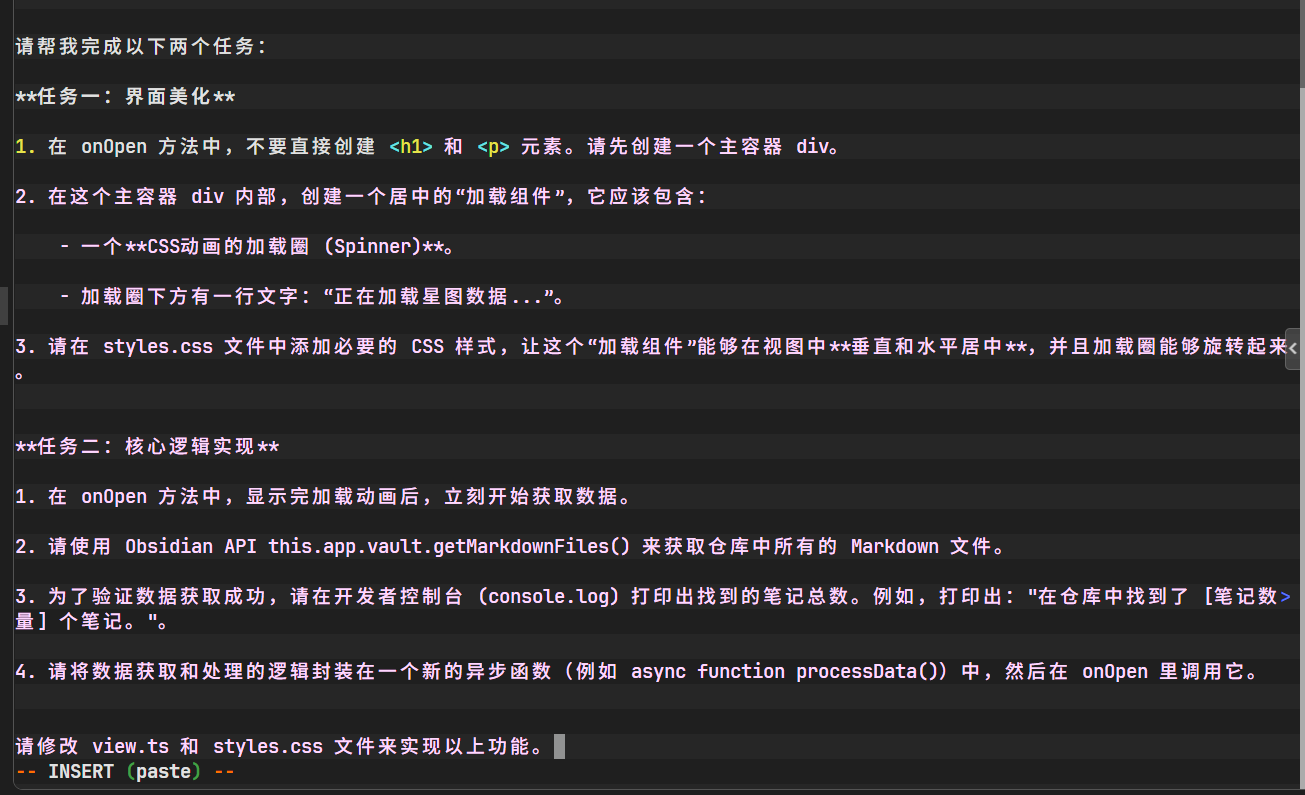 bash请帮我完成以下两个任务: **任务一:界面美化** 1. 在 onOpen 方法中,不要直接创建 <h1> 和 <p> 元素。请先创建一个主容器 div。 2. 在这个主容器 div 内部,创建一个居中的"加载组件",它应该包含: - 一个**CSS动画的加载圈 (Spinner)**。 - 加载圈下方有一行文字:"正在加载星图数据..."。 3. 请在 styles.css 文件中添加必要的 CSS 样式,让这个"加载组件"能够在视图中**垂直和水平居中**,并且加载圈能够旋转起来。 **任务二:核心逻辑实现** 4. 在 onOpen 方法中,显示完加载动画后,立刻开始获取数据。 5. 请使用 Obsidian API this.app.vault.getMarkdownFiles() 来获取仓库中所有的 Markdown 文件。 6. 为了验证数据获取成功,请在开发者控制台 (console.log) 打印出找到的笔记总数。例如,打印出:"在仓库中找到了 [笔记数量] 个笔记。"。 7. 请将数据获取和处理的逻辑封装在一个新的异步函数(例如 async function processData())中,然后在 onOpen 里调用它。 请修改 view.ts 和 styles.css 文件来实现以上功能。