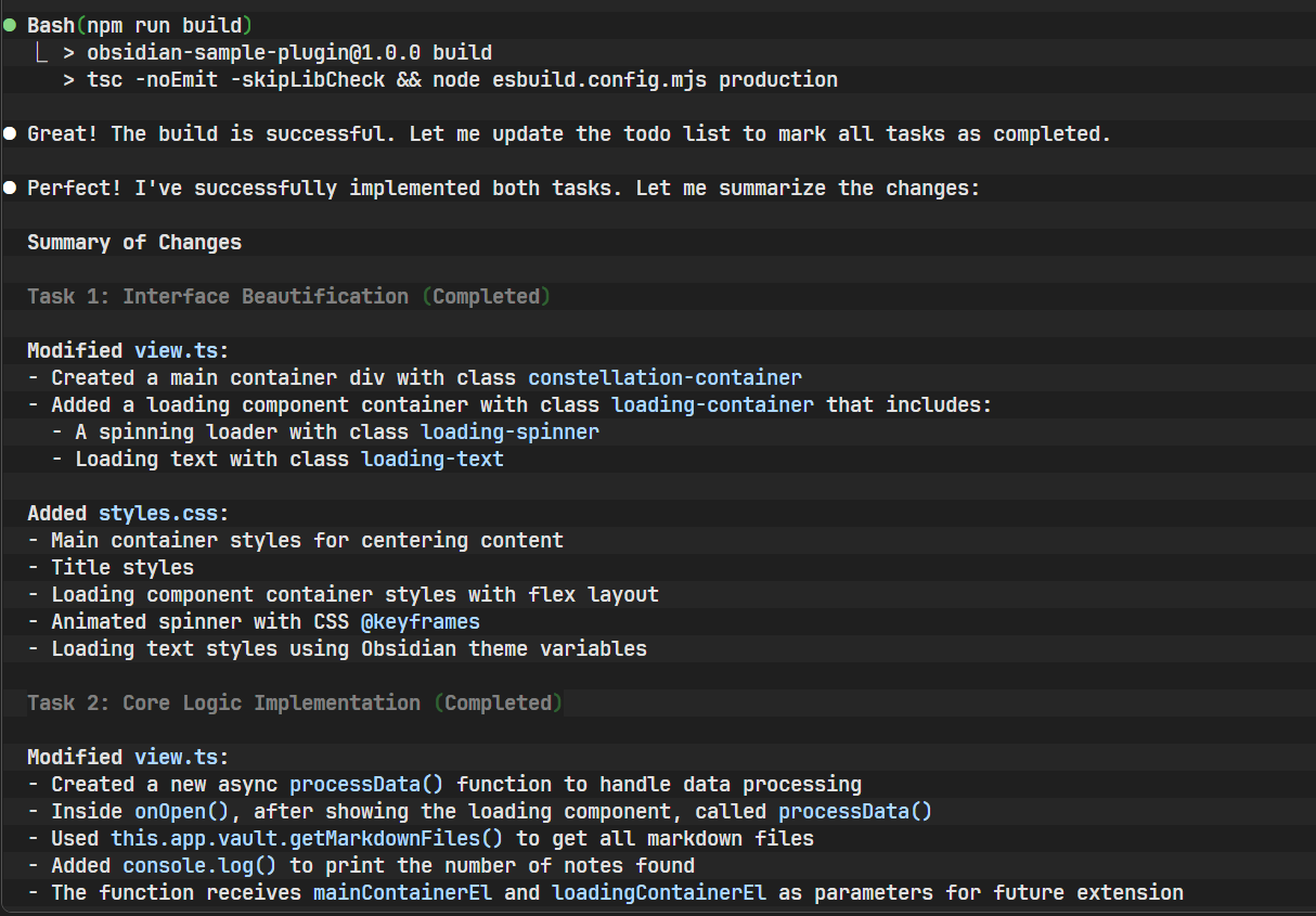本次实战项目充分展示了Doubao-Seed-Code在Agentic Coding任务中的强大能力。通过前后四轮的自然语言交互,我们从一个空白模板开始,成功构建了一款功能完整、视觉效果出色且交互体验良好的Obsidian插件。