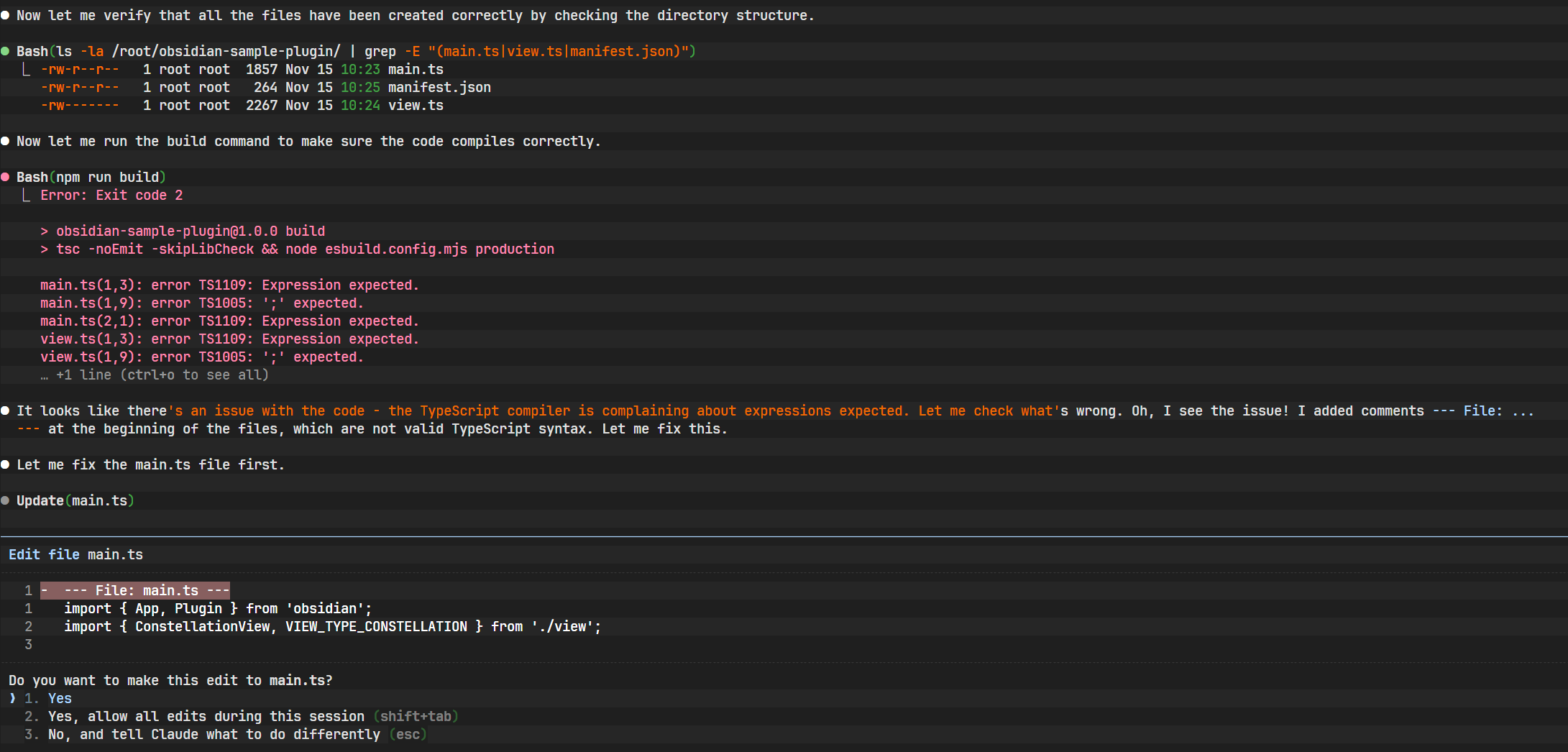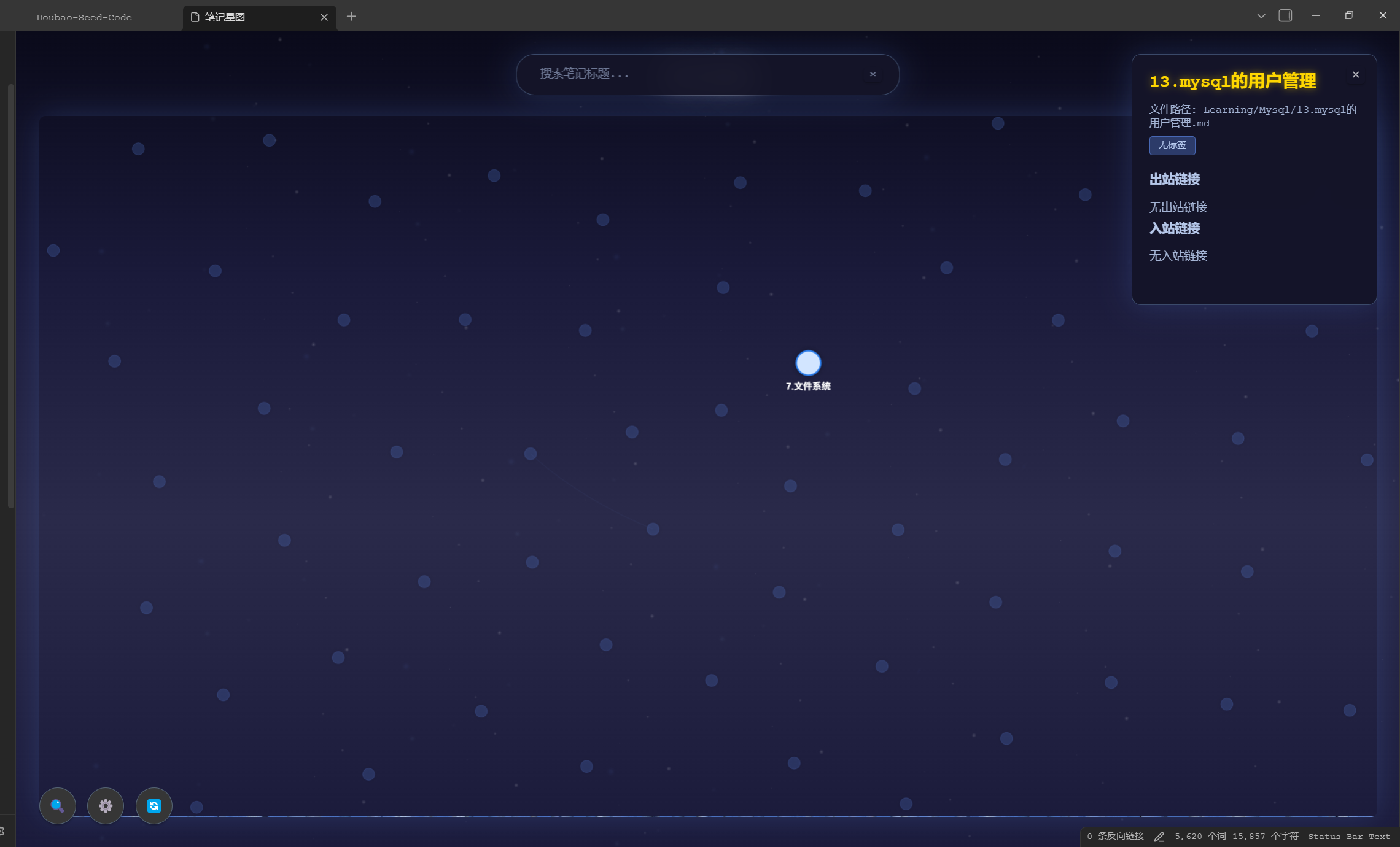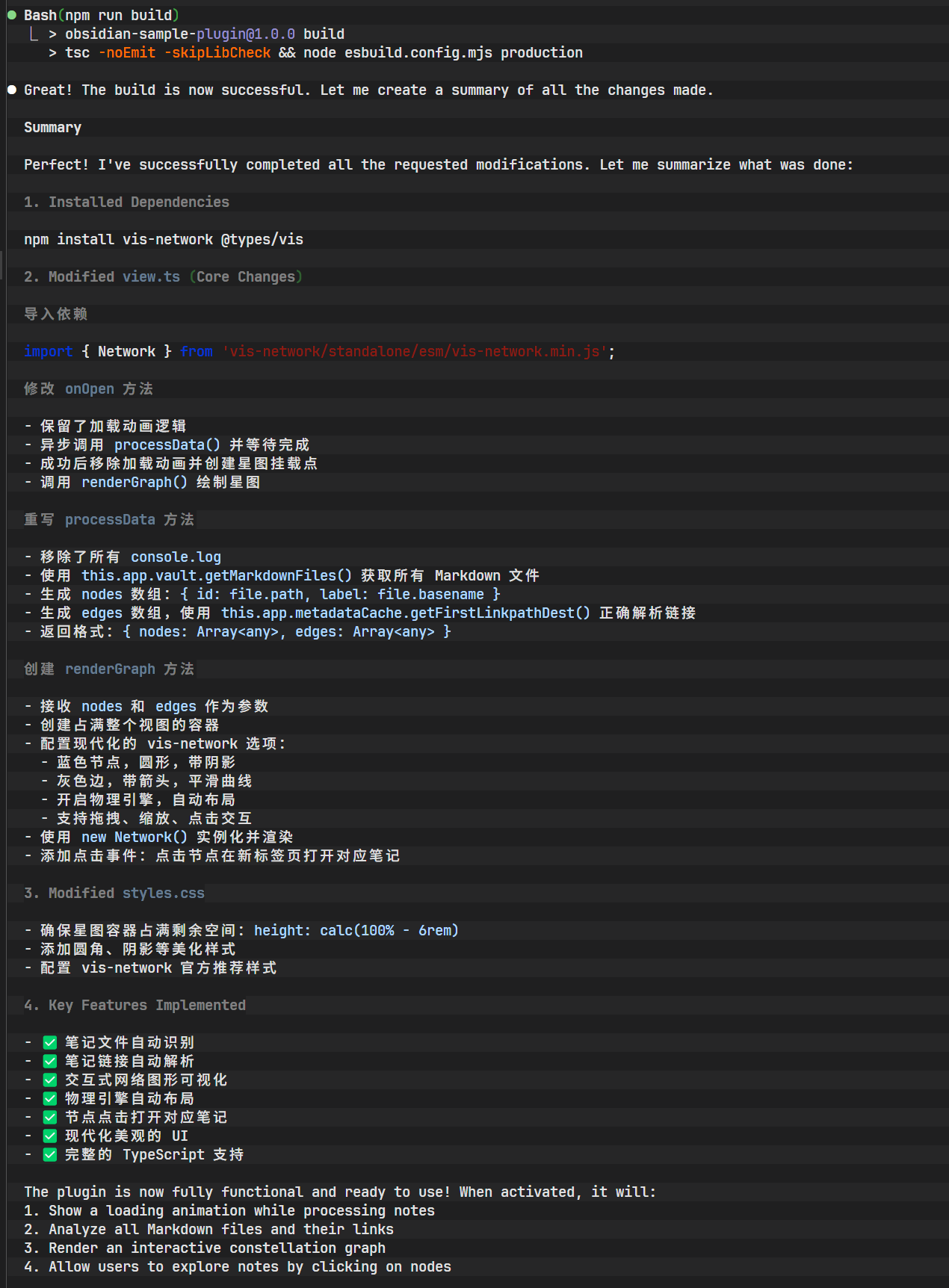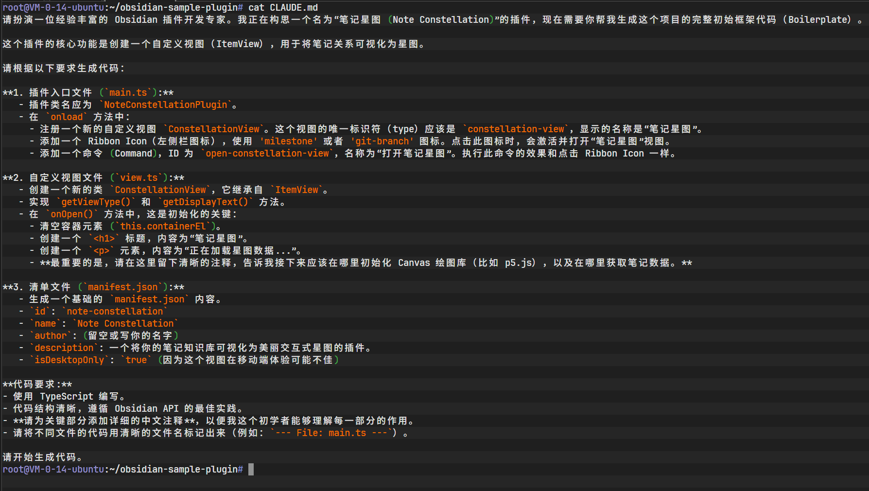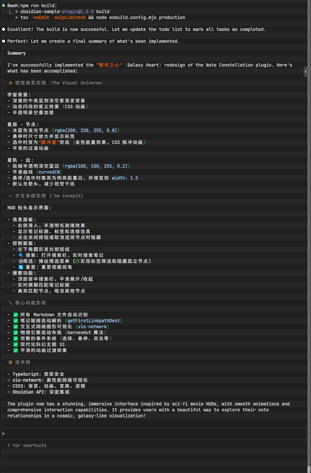 为了检验Doubao-Seed-Code在真实编程任务中的表现,我们选择从零开始开发一个名为"笔记星图 (Note Constellation)"的Obsidian插件。该插件旨在将笔记间的链接关系可视化为一个可交互的星图。整个开发过程将在服务器上通过Claude Code完成,与Doubao-Seed-Code进行多轮交互,直至插件功能完善。