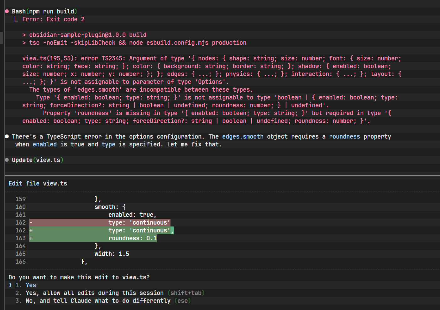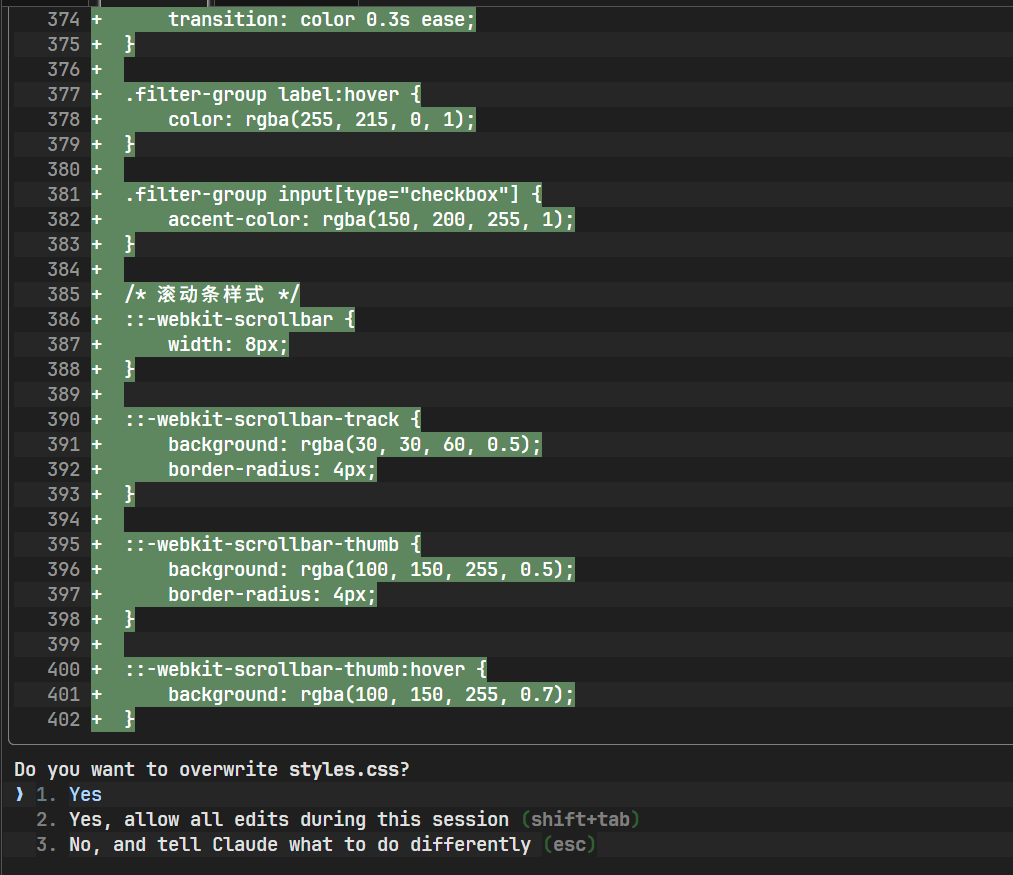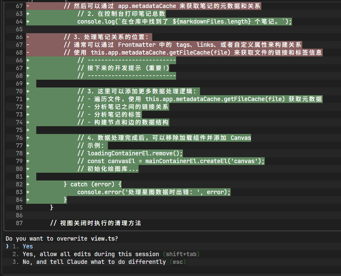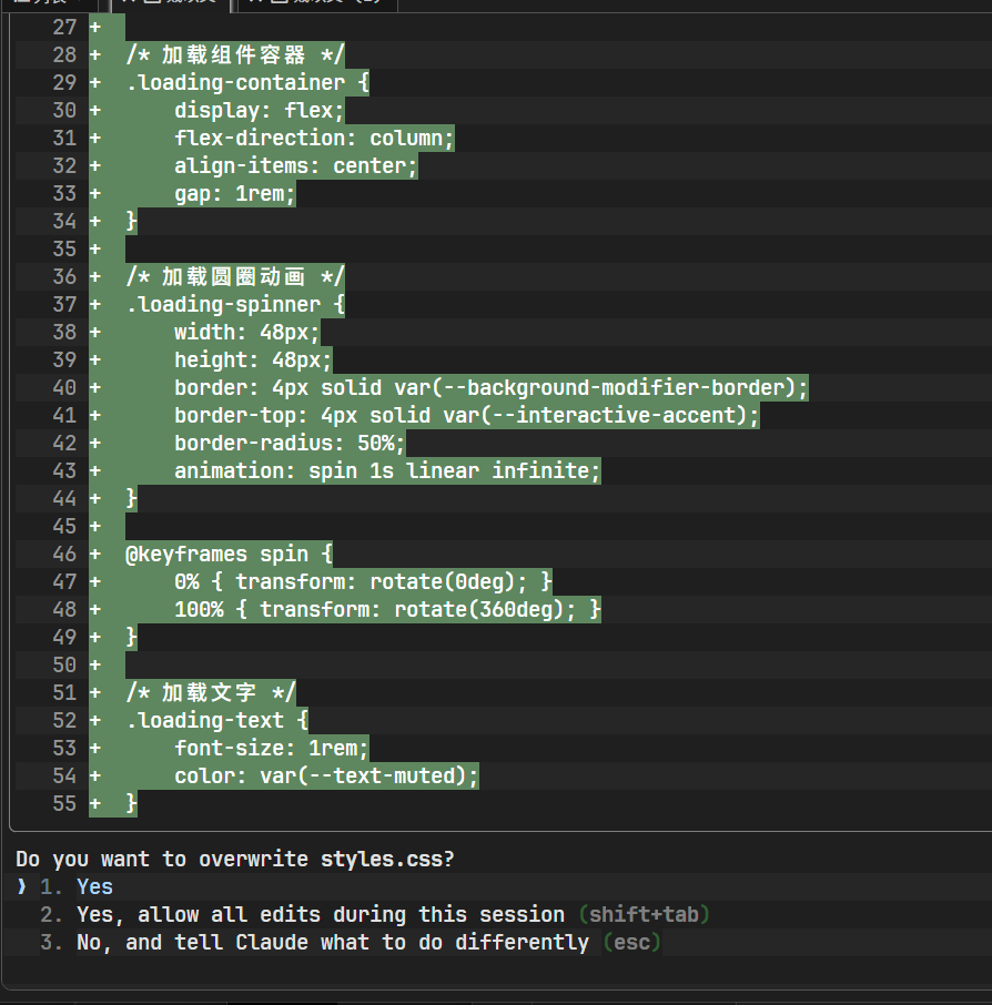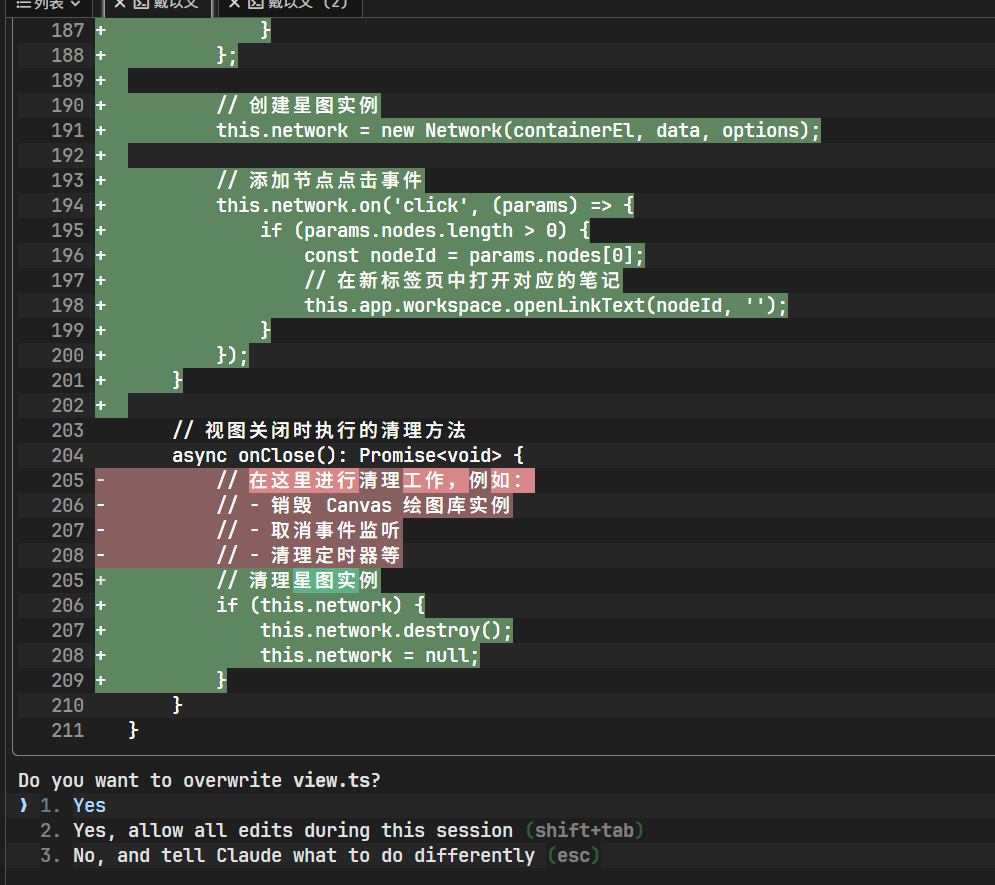 模型生成了新的view.ts和styles.css代码,选择覆盖。