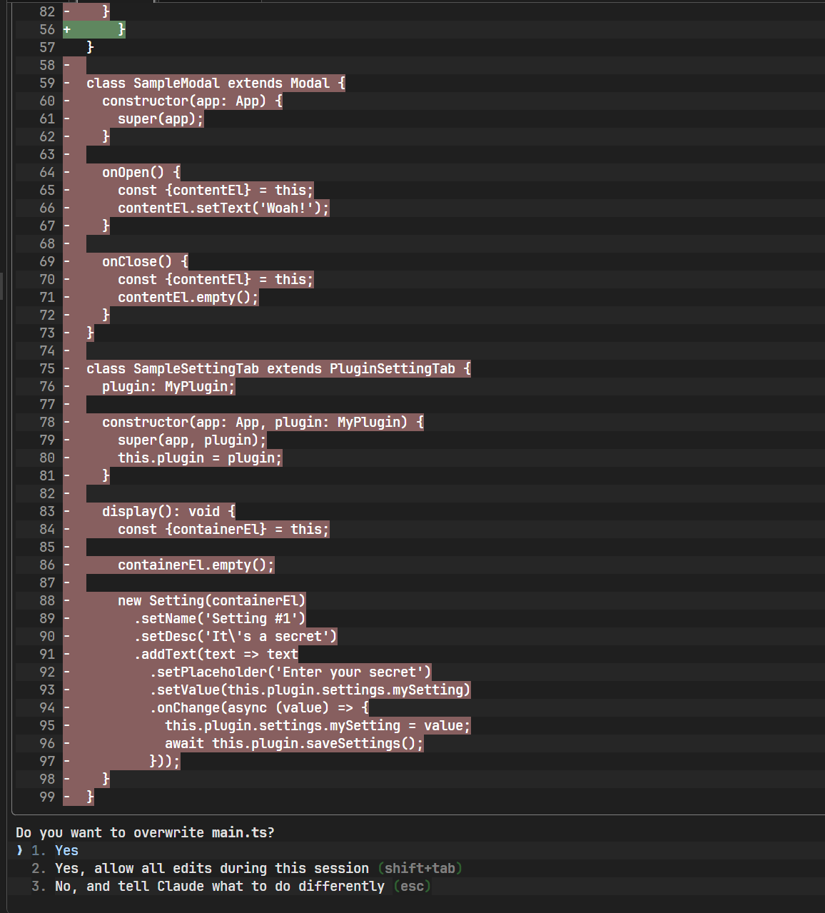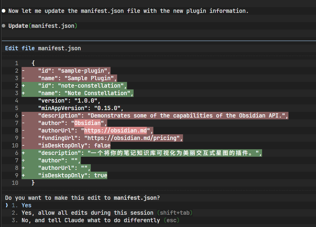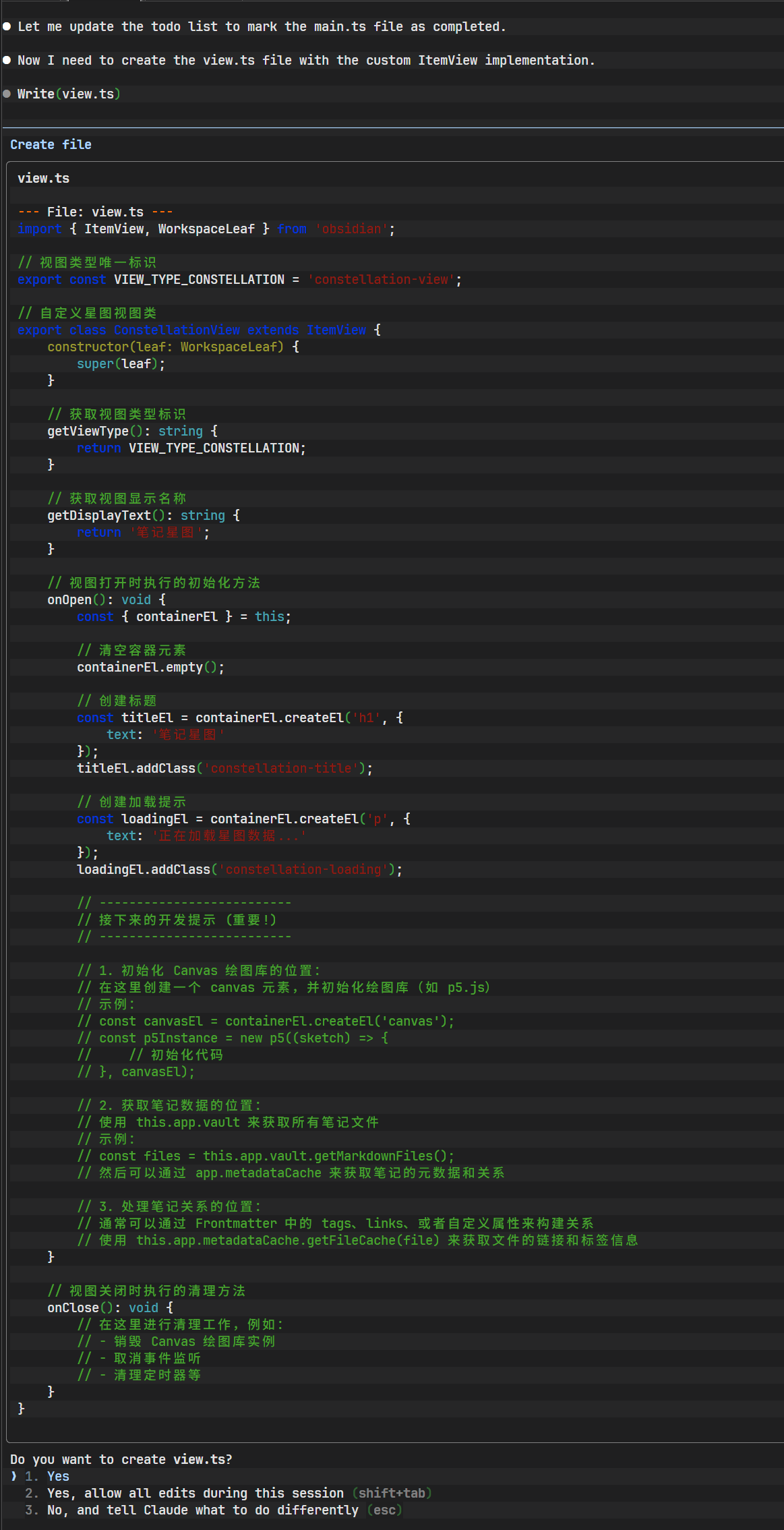 模型逐一确认文件操作,包括覆盖main.ts、创建view.ts和生成manifest.json。