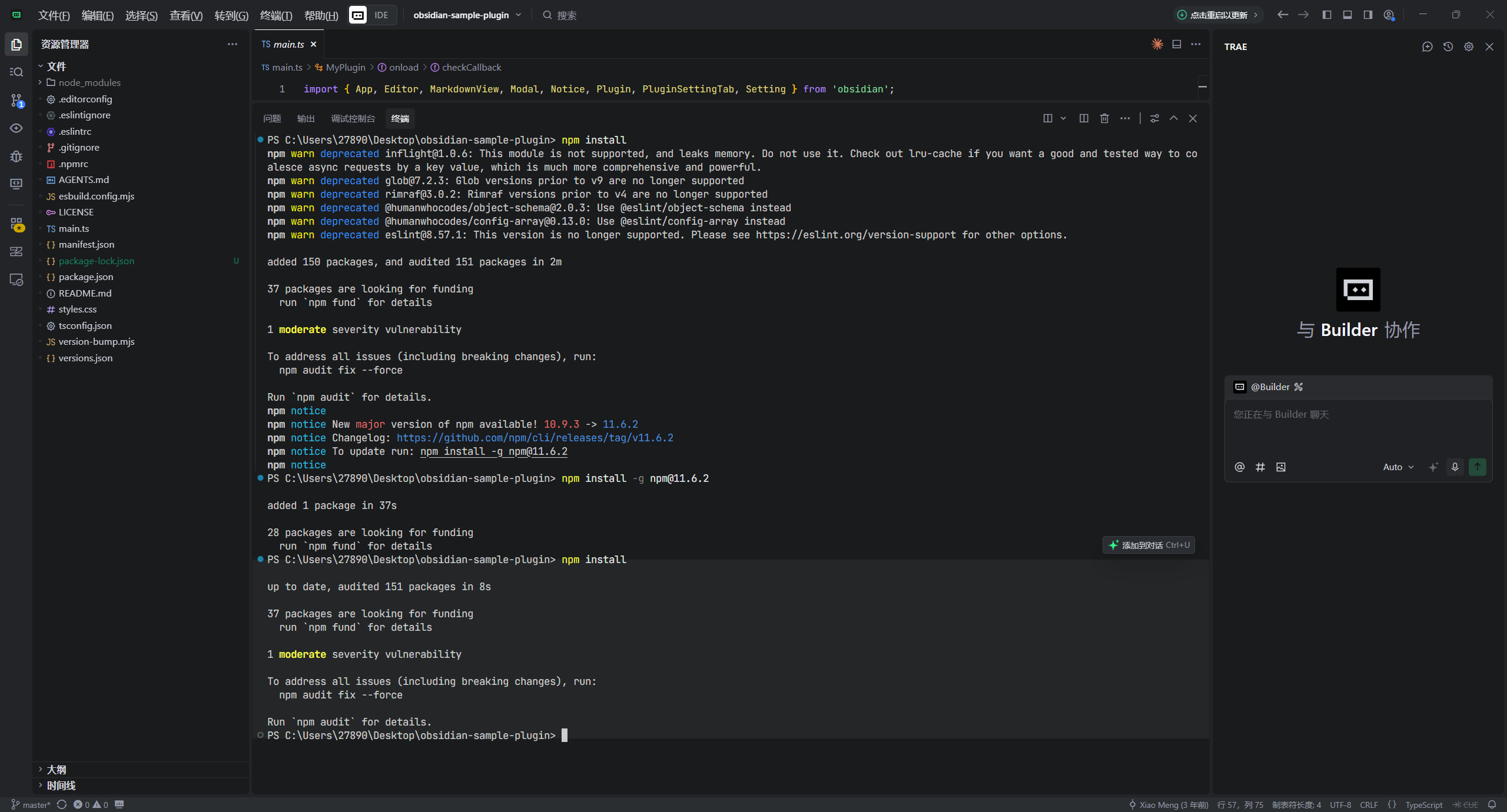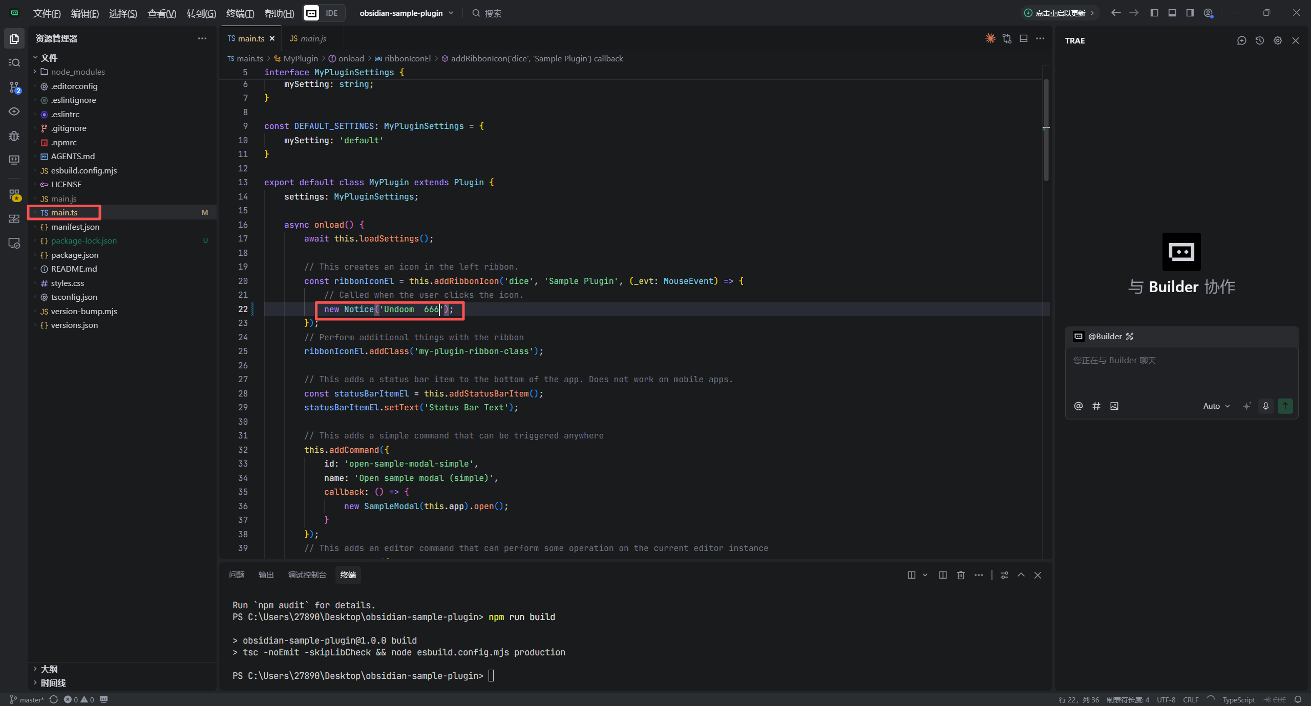 main.ts编译成Obsidian可识别的main.js。将编译产物