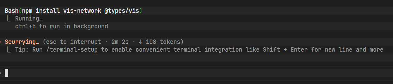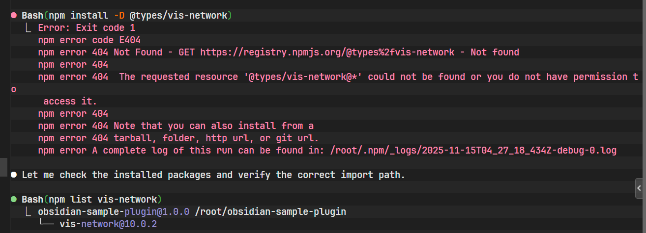 模型首先指导安装vis-network库,初次尝试失败后,它立即纠正了命令并成功安装。