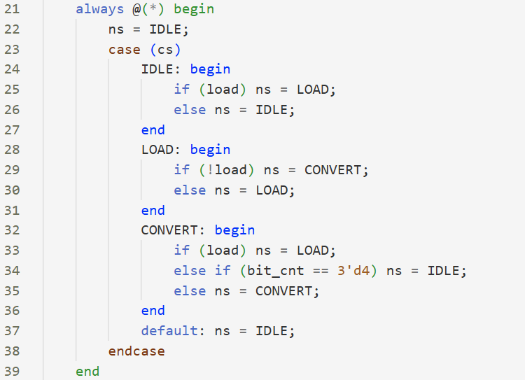 状态转移组合逻辑如下,当检测到load信号时进入LOAD状态,载入结束后load拉低则开始数据转换,当计数达到4时停止转换,进入IDLE状态: