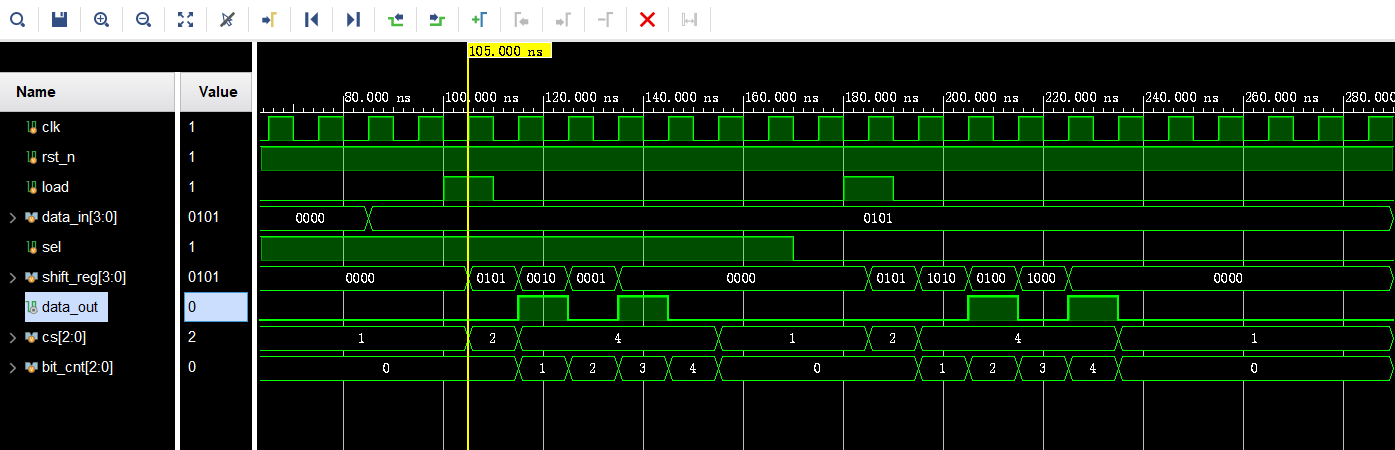 仿真结果如下,可以看到CONVERT状态共持续了四个周期,在shift_reg有效的下一个周期开始输出数据,对于输入数据data_in=4'b0101,在sel为1时串行输出1、0、1、0,在sel为0时串行输出0、1、0、1,正确实现了功能: