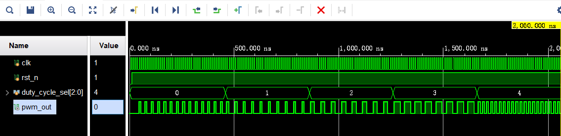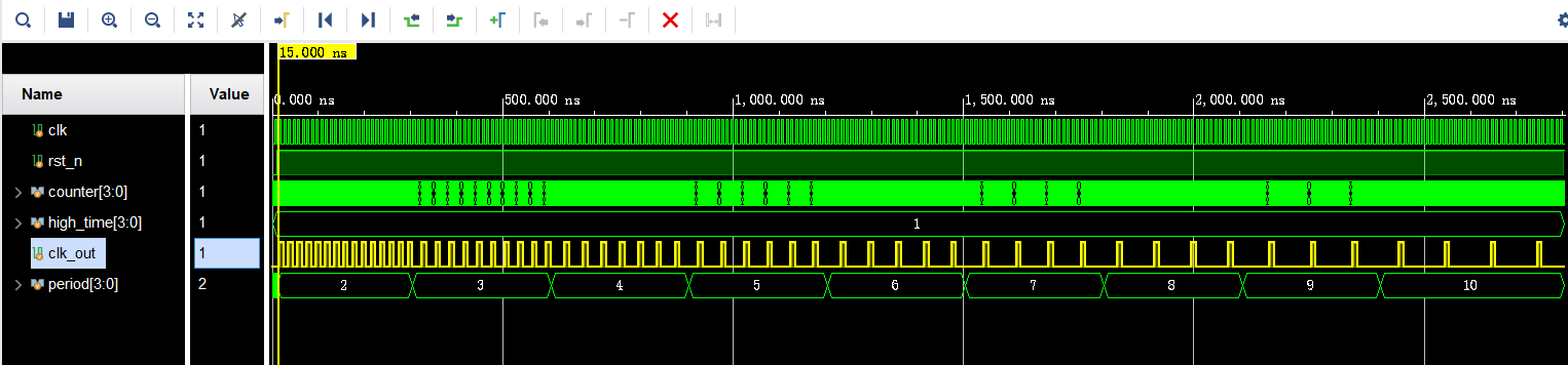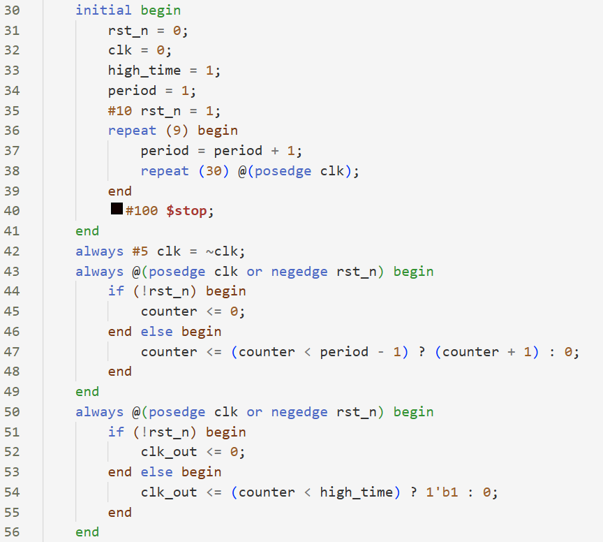 实验要求:使用verilog语言编写测试模块的时钟信号,在确定频率下,每10个时钟周期为一个循环,第一周期提供一个占空比(高电平占一个时钟周期的比例)1:1的clk信号,第二个周期提供一个占空比1:2的clk信号,依次类推,第十个周期提供一个占空比1:9的clk信号。