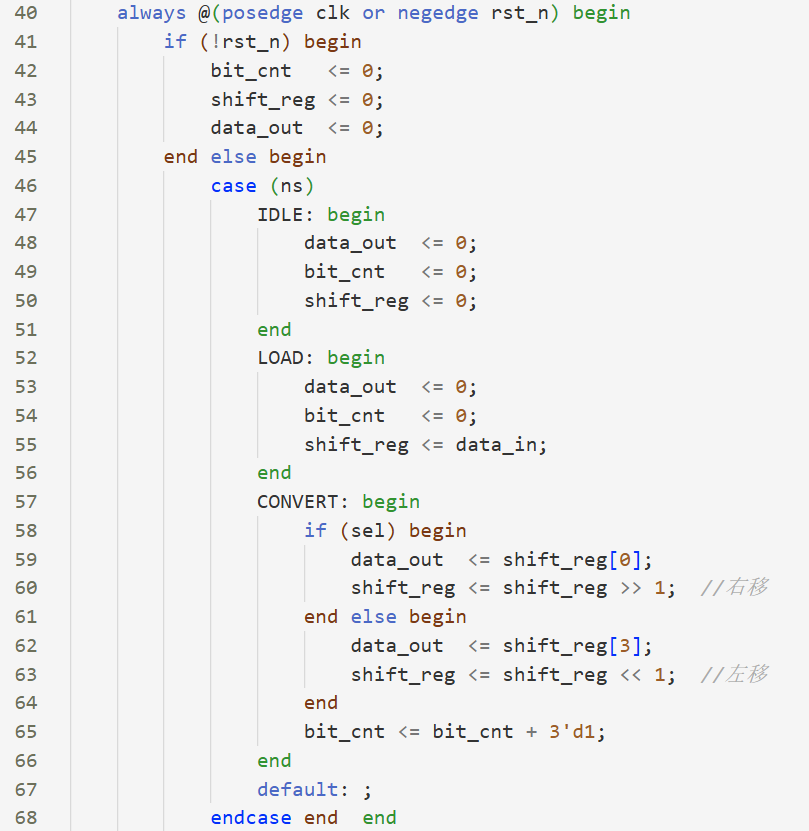 数据输出时序逻辑如下,在LOAD状态锁存数据data_in,在CONVERT状态,sel为1将数据右移输出,为0则左移输出,同时bit_cnt递增: